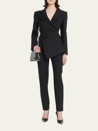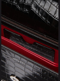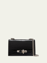 McQueen crocodileembossed leather satchel bag. Sliding chain shoulder strap with mixed charm and pearly embellishments. Flap top with fourring jeweled knuckle duster; magnetic closure. 5.7"H x 9.5"W x 3.2"D. Made in Italy.