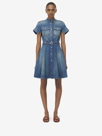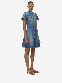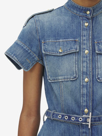 Mini dress in indigo stonewashed shirting denim. Detailed with a mandarin collar, two epaulettes, flap pockets on the chest and a buckled waist belt. Finished with a front button fastening. Product details - Mandarin collar - Two flap pockets - Front button fastening - Made with organic cotton yarn - Product code: 816098QMAC34315 - Made in Italy - Material: Cotton