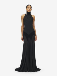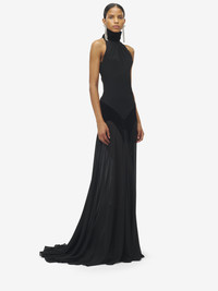 Evening dress in black silk georgette. High neck with gathered detailing and semi-sheer long skirt with train. Finished with a button and zip fastening on the back. Product details - High neck - Semi-sheer skirt with train - Back button and zip fastening - Product code: 842905QBADS1000 - Made in ITALY - Material: 100% Silk