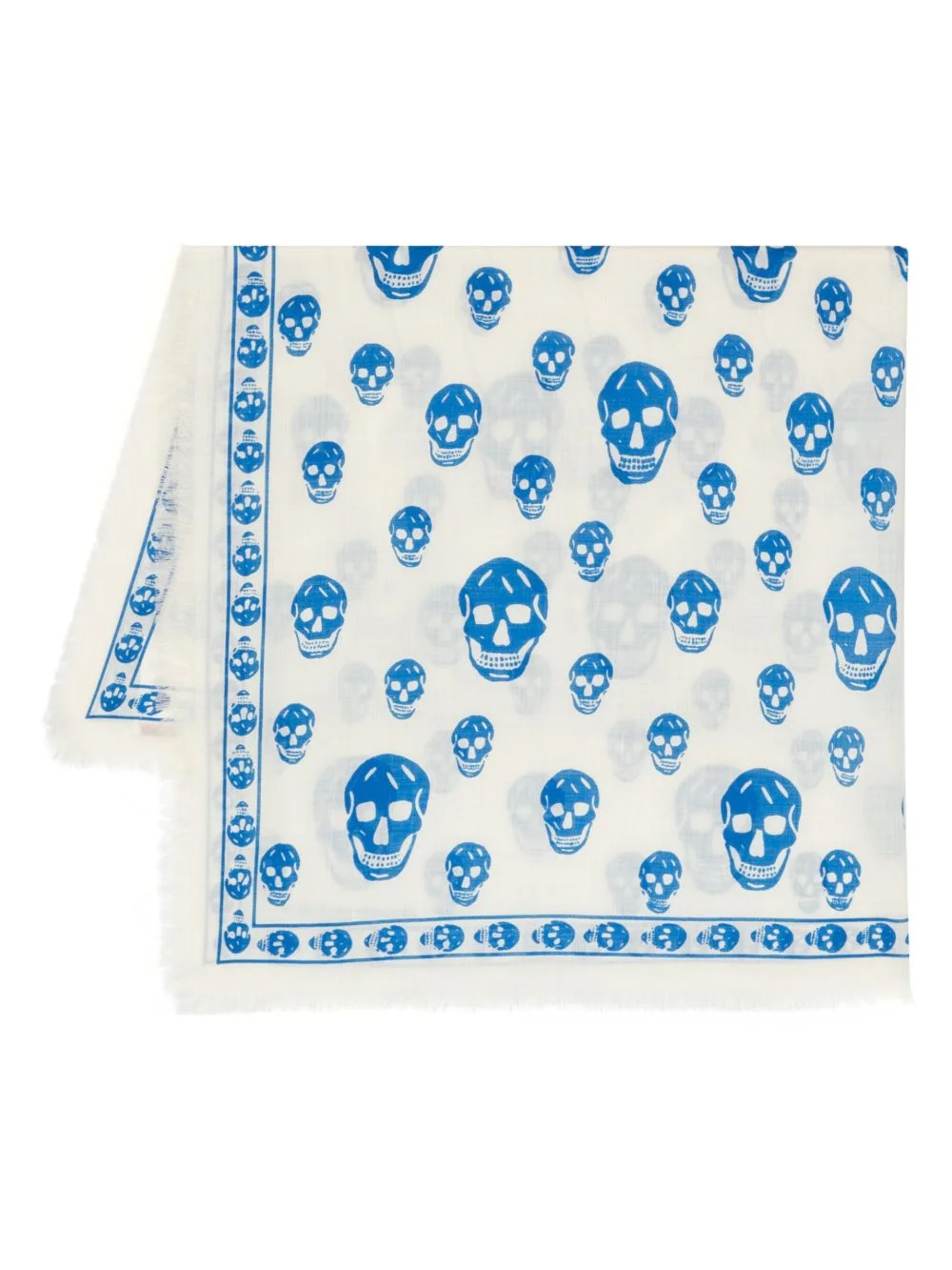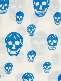 skull-print wool scarf Alexander McQueen's scarf is decorated with a skull motif all over, an icon of the brand ever since its inception in 1992. Highlights - Blue/white - Wool - Skull print - Logo print to the front - Square body - Frayed edge Made in Italy Composition Wool 100% SIZE & FIT Measurement LENGTH 47.24 in(120 cm) WIDTH 40.94 in(104 cm) Washing instructions Dry Clean Only