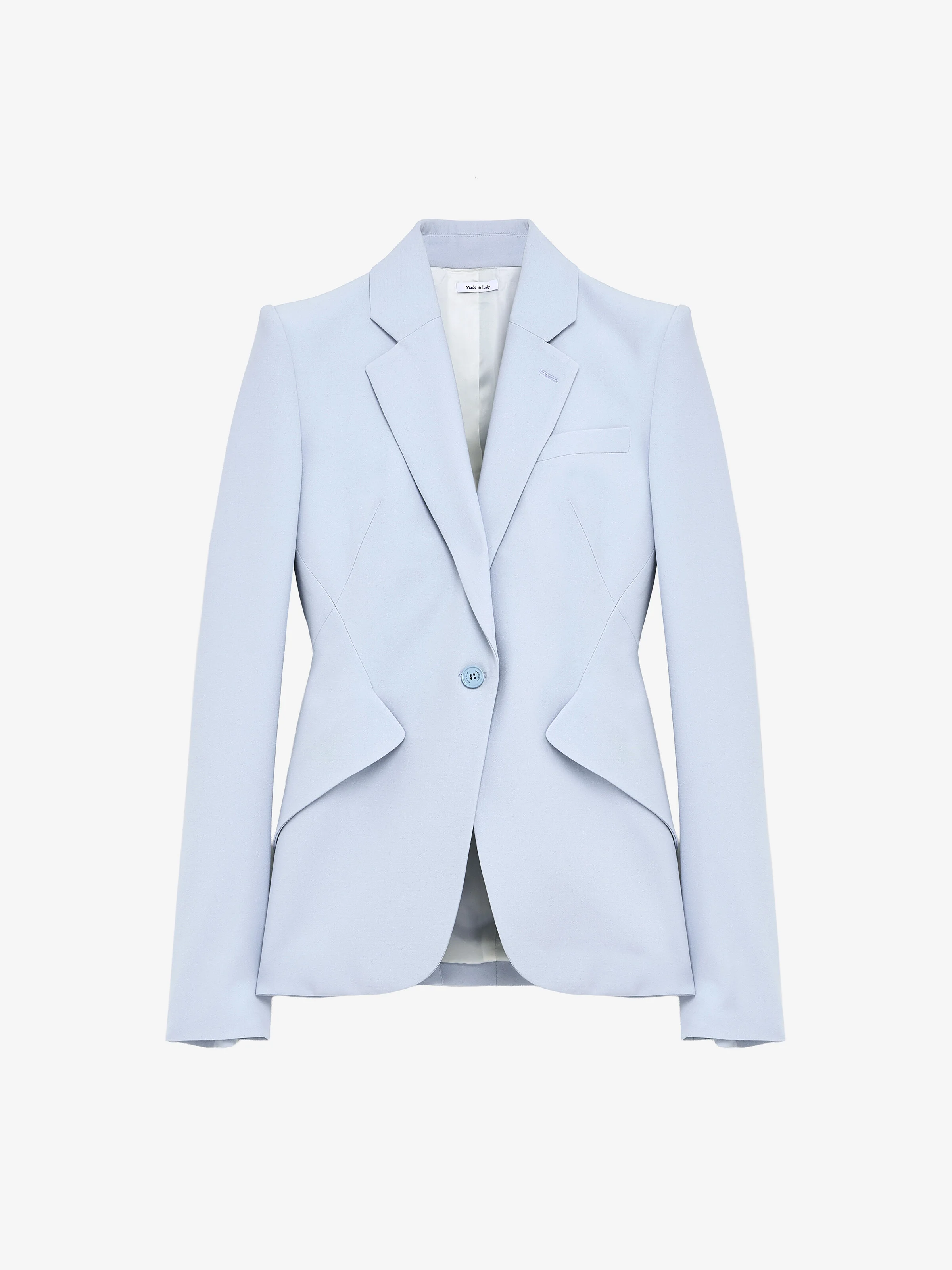 Single-breasted jacket in ice blue leaf crepe. Notched lapels, chest pocket and two flap pockets on the sides. Finished with a T-Bar chain back detail. Complete the look with the matching trousers. Product details - Notched lapels - Side flap pockets - Single button fastening - Product code: 857750QEAAA4602 - Made in ITALY - Material: 52% Viscose, 48% Acetate
