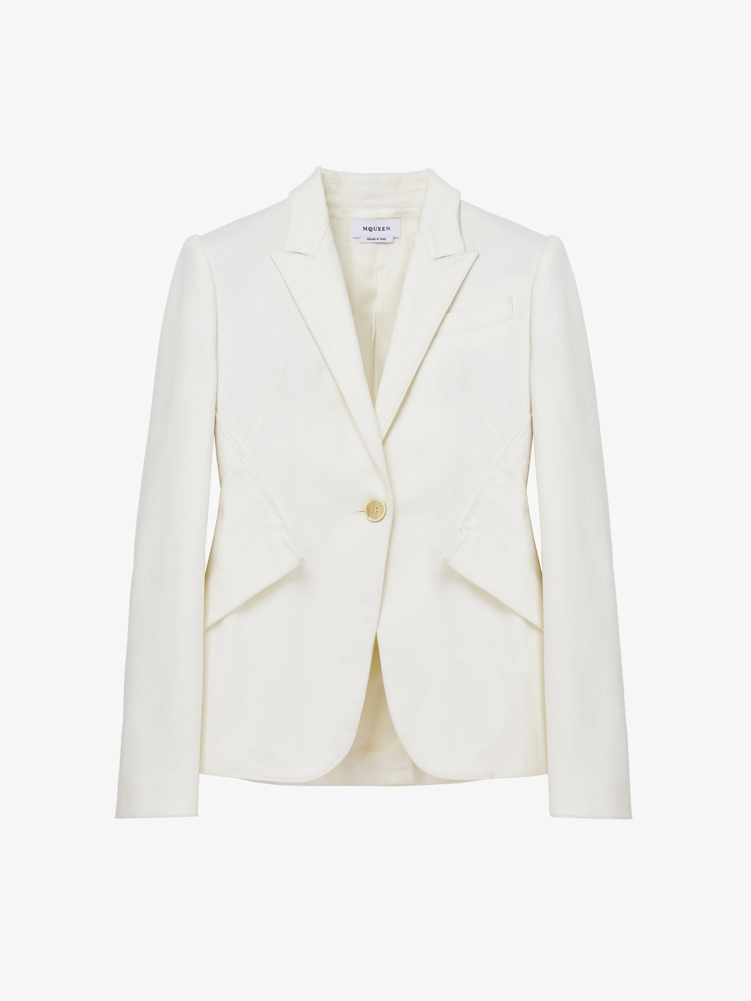 Single-breasted jacket in optical white stretch denim. Peak lapels, chest pocket and two side flap pockets. Finished with tonal topstitching and raw edge detailing. Complete the look with the matching jeans. Product details - Peak lapels - Side flap pockets - Single button fastening - Product code: 830574QZAON9000 - Made in Italy - Material: 98% Cotton, 2% Elastane