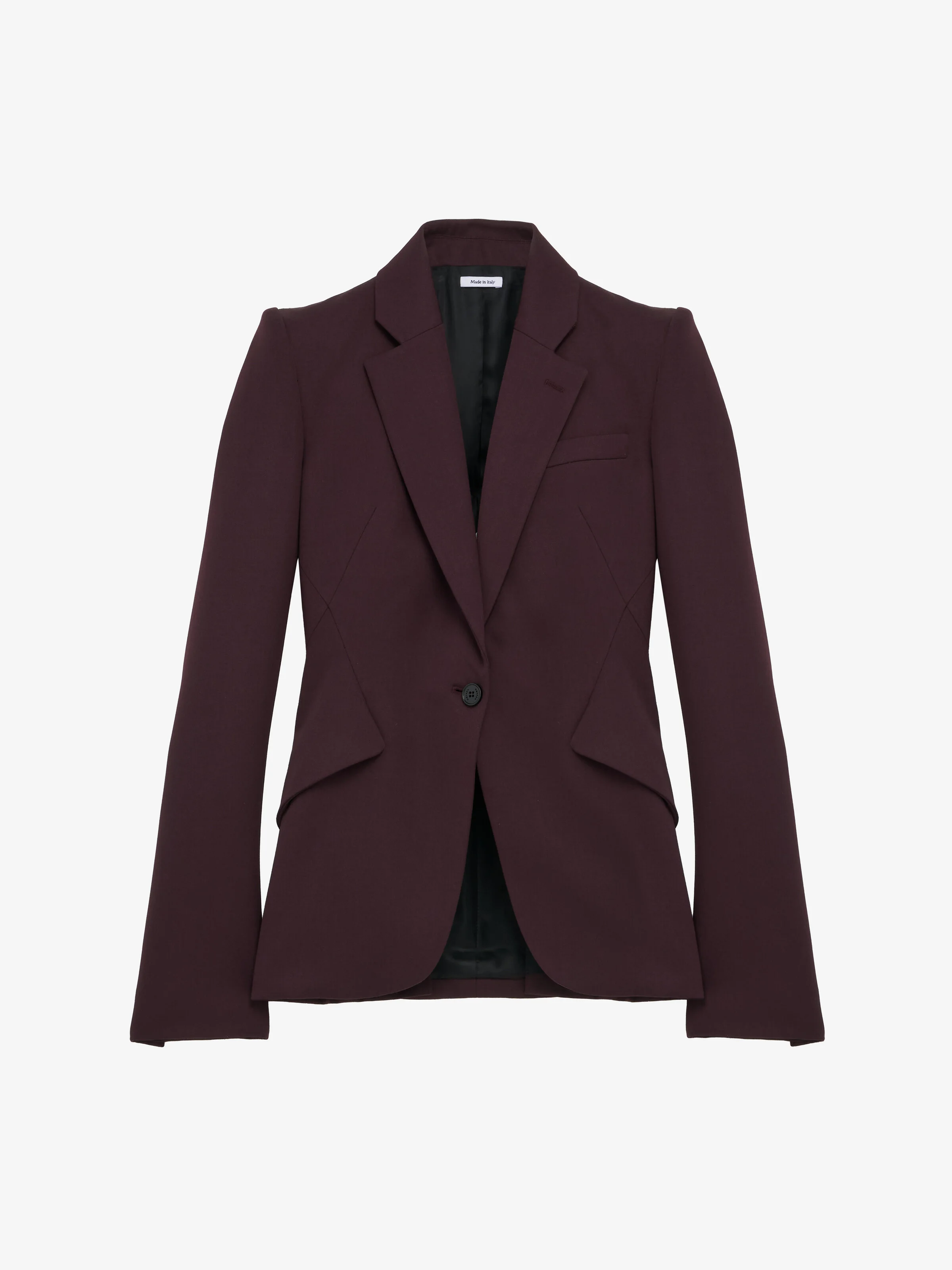 Single-breasted jacket in oxblood grain de poudre. Notched lapels, chest pocket and two flap pockets on the sides. Finished with a T-Bar chain back detail. Complete the look with the matching trousers. Product details - Notched lapels - Side flap pockets - Single button fastening - This product contains 39% of certified wool and 61% of wool sourced from producers following regenerative practices, Kering is partnering among others with the Savory Institute to promote and support the regenerative production of raw materials and utilize Savory's institute methodology, (Ecological Outcome Verification) - Product code: 857750QJAAC5146 - Made in ITALY - Material: 100% Wool