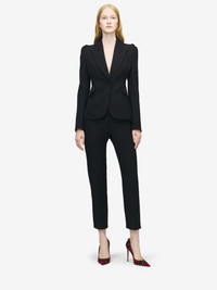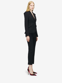 Single-breasted jacket in black grain de poudre. Peak lapels, chest pocket and two flap pockets on the sides. Finished with a T-Bar chain back detail. Product details - Peak lapels - Side flap pockets - Single button fastening - This product contains 39% of certified wool and 61% of wool sourced from producers following regenerative practices, Kering is partnering among others with the Savory Institute to promote and support the regenerative production of raw materials and utilize Savory's institute methodology, (Ecological Outcome Verification) - Product code: 847018QJAAC1000 - Made in ITALY - Material: 100% Wool