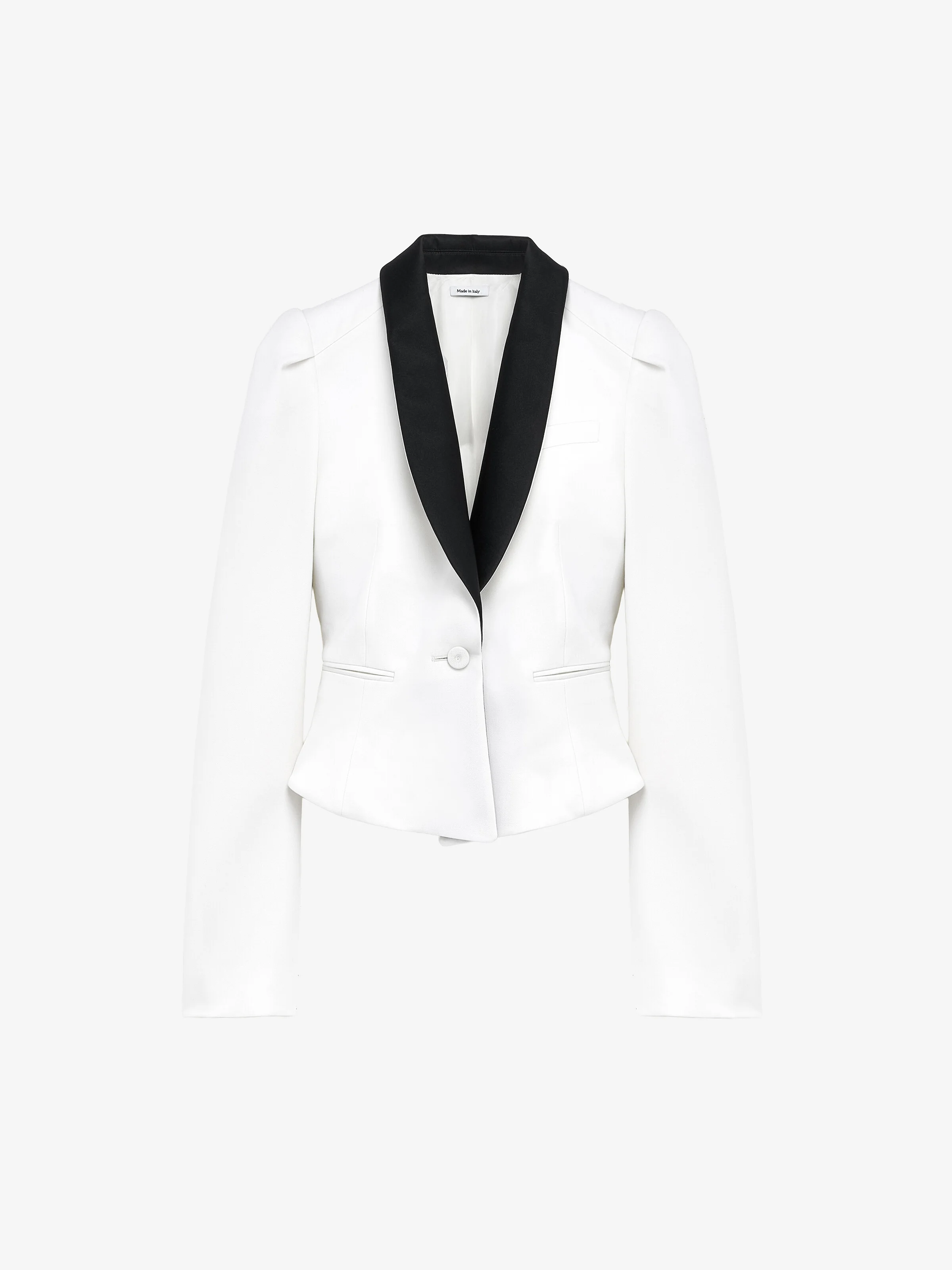 Single-breasted tuxedo jacket. Soft white grain de poudre with black shawl lapels. Gathered shoulders, chest pocket, side jetted pockets and single button fastening. Finished with a T-Bar chain back detail. Product details - Shawl lapels - Side jetted pockets - Single button fastening - This product contains 39% of certified wool and 61% of wool sourced from producers following regenerative practices, Kering is partnering among others with the Savory Institute to promote and support the regenerative production of raw materials and utilize Savory's institute methodology, (Ecological Outcome Verification) - Product code: 847009QJAAC9016 - Made in ITALY - Material: 100% Wool