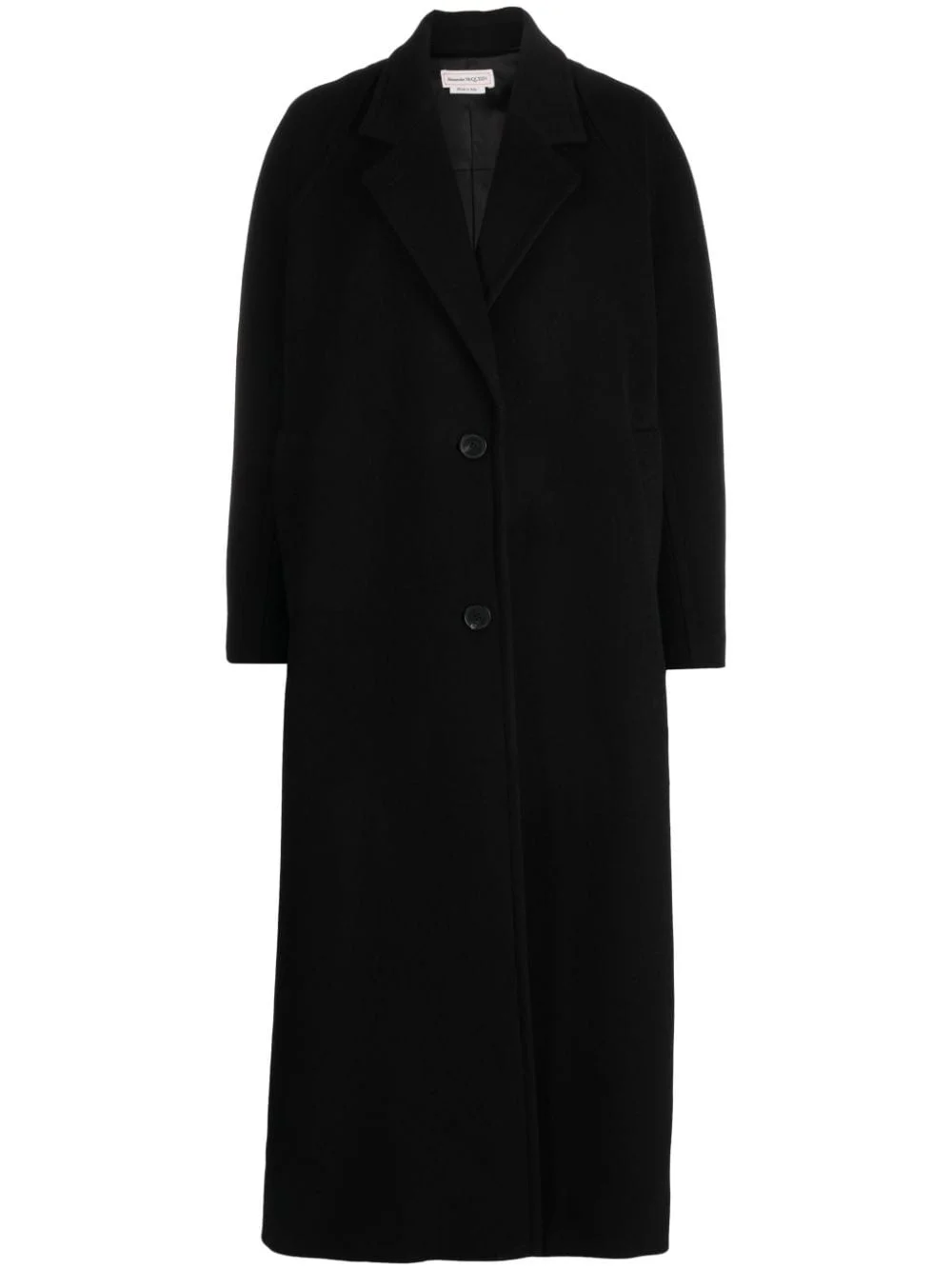 single-breasted wool-blend coat Made in Italy from wool and cashmere, this black single-breasted coat speaks to Alexander McQueen's penchant for understated and timeless outerwear. It has notch lapels and falls to a relaxed mid-calf length. Highlights - Black - Wool-cashmere blend - Notched lapels - Front button fastening - Long sleeves - Two side slit pockets - Central rear vent - Satin lining - Mid-calf length - Straight hem Made in Italy Composition Lining: Cupro 100%, Cashmere 10% Outer: Wool 90% SIZE & FIT Model measurements Height 5 ft 10 in(1.78 m) Bust/Chest 33.07 in(84 cm) Hips 36.61 in(93 cm) Waist 24.8 in(63 cm) FittingInformation Designed to be unstructured, offering a loose fit throughout Made from a midweight non-stretch fabric This piece fits true to size – take your usual size Washing instructions Dry Clean Only