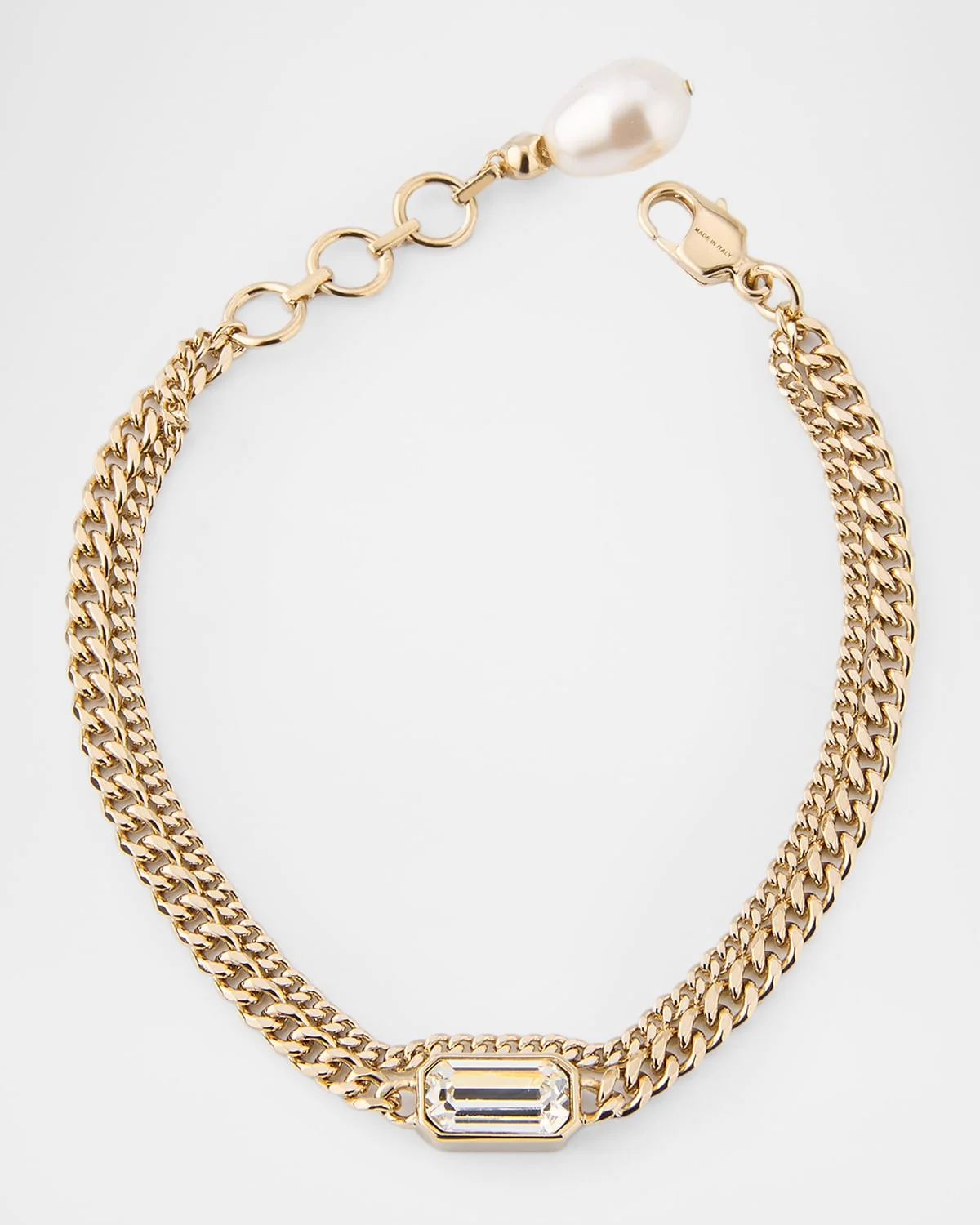 McQueen showcases an emeraldcut crystal on this doublechain bracelet, finished with a pearly bead and the brand's iconic skull logo on the extender chain. Brass hardware with a golden finish Clear crystal and one pearly bead Lobster clasp with signature skull Adjustable length Made in Italy