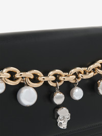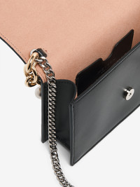 The Skull Bag – structured body in smooth black calf leather. The chunky gold-finished chain with metallic spheres and imitation pearls can be used as a handle. The bag can be worn cross-body with the silver-tone chain strap. Product details - Dimensions: Length 19 x Height 13 x Depth 5 cm / 7.4 x 5.1 x 1.9 inches - Magnet fastening - One central compartment and one card pocket - Accommodates smartphones - Product code: 856329C8ZXX1000 - Made in ITALY - Material: Calf Leather