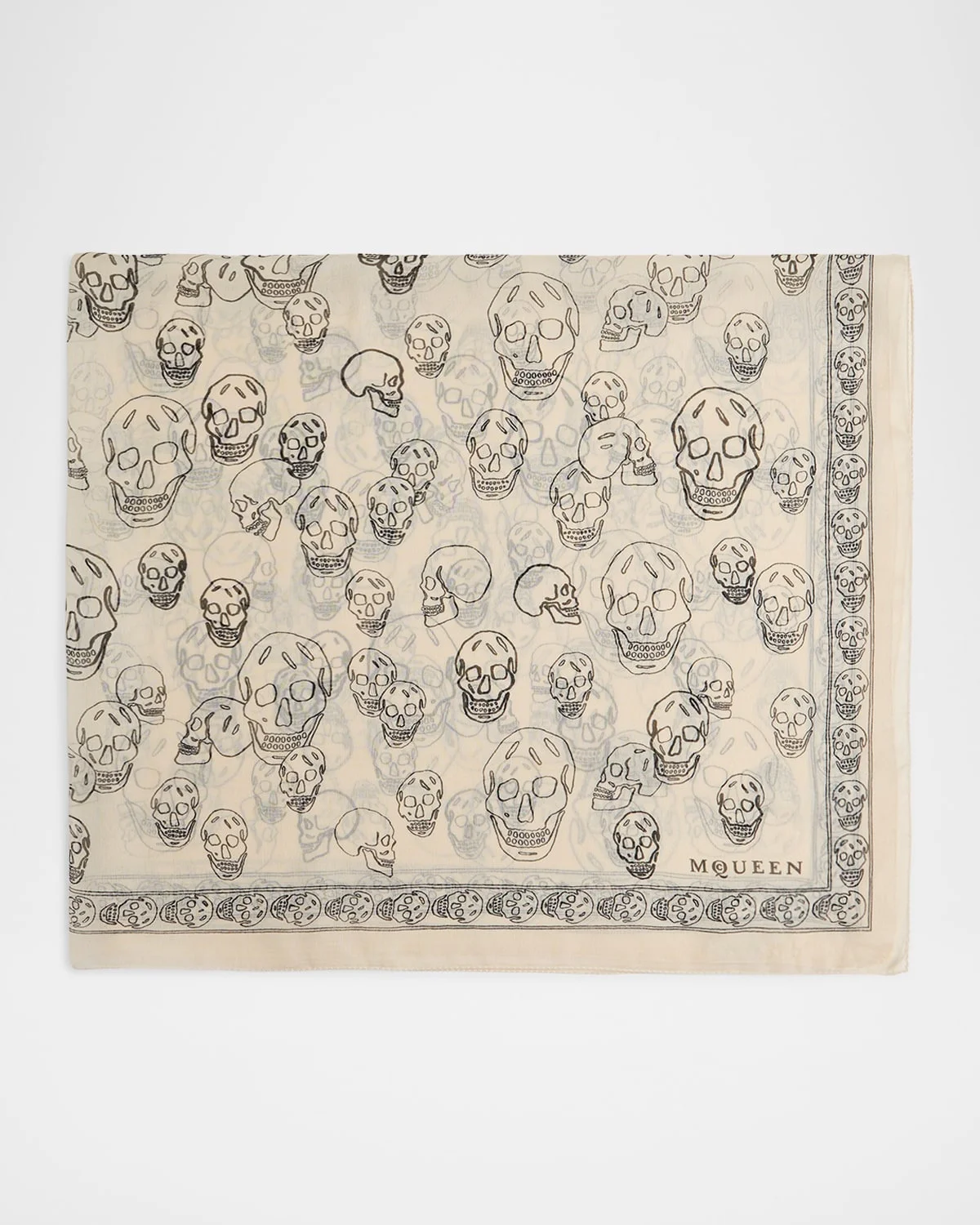 McQueen woven scarf featuring the house's repeated skull pattern and skull border Approx. 45"L x 40.0"W May be styled multiple ways Silk Made in Italy
