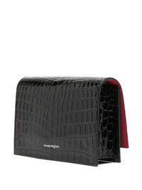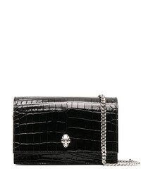 skull-embellished clutch bag Alexander McQueen's skull motif is a signature detail, displaying the brand's penchant for the macabre. Made from crocodile-effect leather, this clutch bag comes with an optional chain-link strap for hands-free wear. Highlights - Black - Calf leather - Embossed crocodile effect - Skull stud embellishment - Logo print to the rear - Silver-tone hardware - Detachable chain-link shoulder strap - Front flap closure - Magnetic fastening - Main compartment - Internal card slot Made in Italy Composition Outer: Calf Leather 100% SIZE & FIT Measurement DEPTH 1.96 in(5 cm) HEIGHT 5.11 in(13 cm) STRAP 20.47 in(52 cm) WIDTH 7.48 in(19 cm)