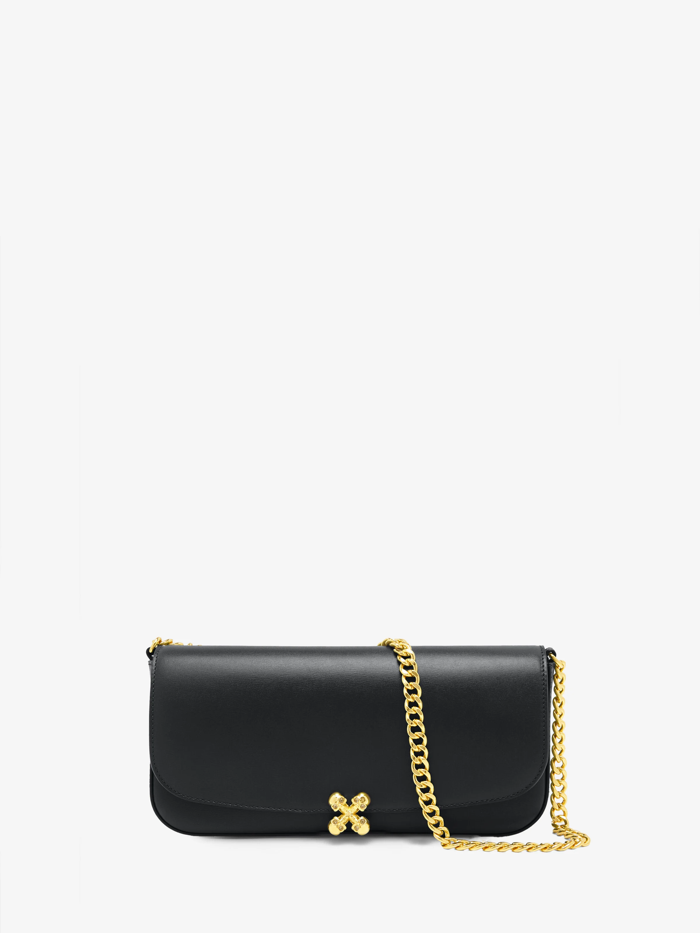 The Skull Flower Bag – elongated east-west silhouette crafted from black smooth calf leather. Rounded flap with crystal-embellished McQueen Skull Flower. The bag can be worn on the shoulder using the chain strap. Product details - Dimensions: Length 25 x Height 13 x Depth 4 cm / 9.8 x 5.1 x 1.6 inches - Strap drop: 28 cm / 11 inches - McQueen foil lettering on the back - Magnetic fastening - One main compartment with card slot - Brass hardware with shiny gold finishing - Black suede-effect lining - Product code: 8360381MAAE1000 - Made in Italy - Material: Calf Leather