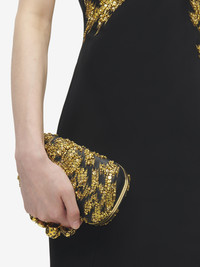 The Skull Knuckle Clutch – black nappa leather base embellished with a hand-sewn Wrapped Floral embroidery made of glass stones and beads, brass beads and sequins. The bag features a handle adorned with crystal-encrusted rings and can be worn either hand-held or over the shoulder with its antique gold-finished chain. Product details - Dimensions: 10 x 18 x 5cm / 3.9 x 7 x 1.9 inches - Strap drop: 55cm / 21.6 inches - Antique gold-finished handle adorned with crystal-encrusted rings - Detachable chain strap - Brass hardware with antique gold finishing - Suede lining - Due to the appearance of the product, we recommend stowing it in your hold luggage when passing through airport security. For the same reason we recommend not taking the bag to public places, such as law courts and sports stadiums, where there may be security checks. - Product code: 676256KR7728500 - Made in Italy - Material: 45% Glass, 35% Brass, 15% Polyester, 5% Viscose