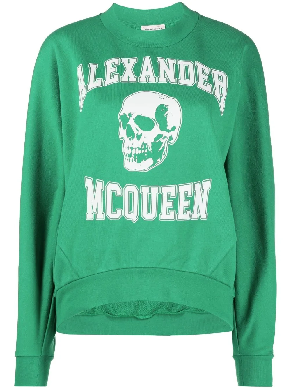 skull-print stretch-cotton sweatshirt The iconic skull motif at the front of this green Alexander McQueen sweatshirt puts a subversive spin on the collegiate-inspired logo lettering surrounding it. It’s from cut from stretch cotton jersey to a relaxed silhouette. Highlights - Bright green - White - Skull print to the front - Logo print to the front - Crew neck - Long sleeves - Straight hem Made in Italy Composition Cotton 98%, Elastane 2% SIZE & FIT Model measurements Height 5 ft 10 in(1.79 m) Bust/Chest 31.1 in(79 cm) Hips 35.03 in(89 cm) Waist 24.01 in(61 cm) FittingInformation Designed to be unstructured, offering a loose fit throughout The ribbed hem offers a close, comfortable fit This piece fits true to size – take your usual size Washing instructions Hand Wash