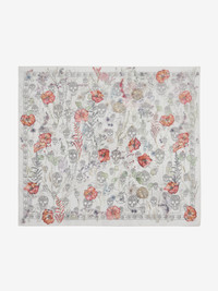 Ivory and medium grey ladder silk chiffon scarf featuring an all-over skull motif with a multicoloured Spider Floral overprint. The scarf is finished with a skull border and the McQueen logo in the bottom right corner. Product details - Dimensions: 104 x 120cm / 40.9 x 47.2 inches - Product code: 8585313052Q9262 - Made in ITALY - Material: 100% Silk