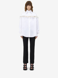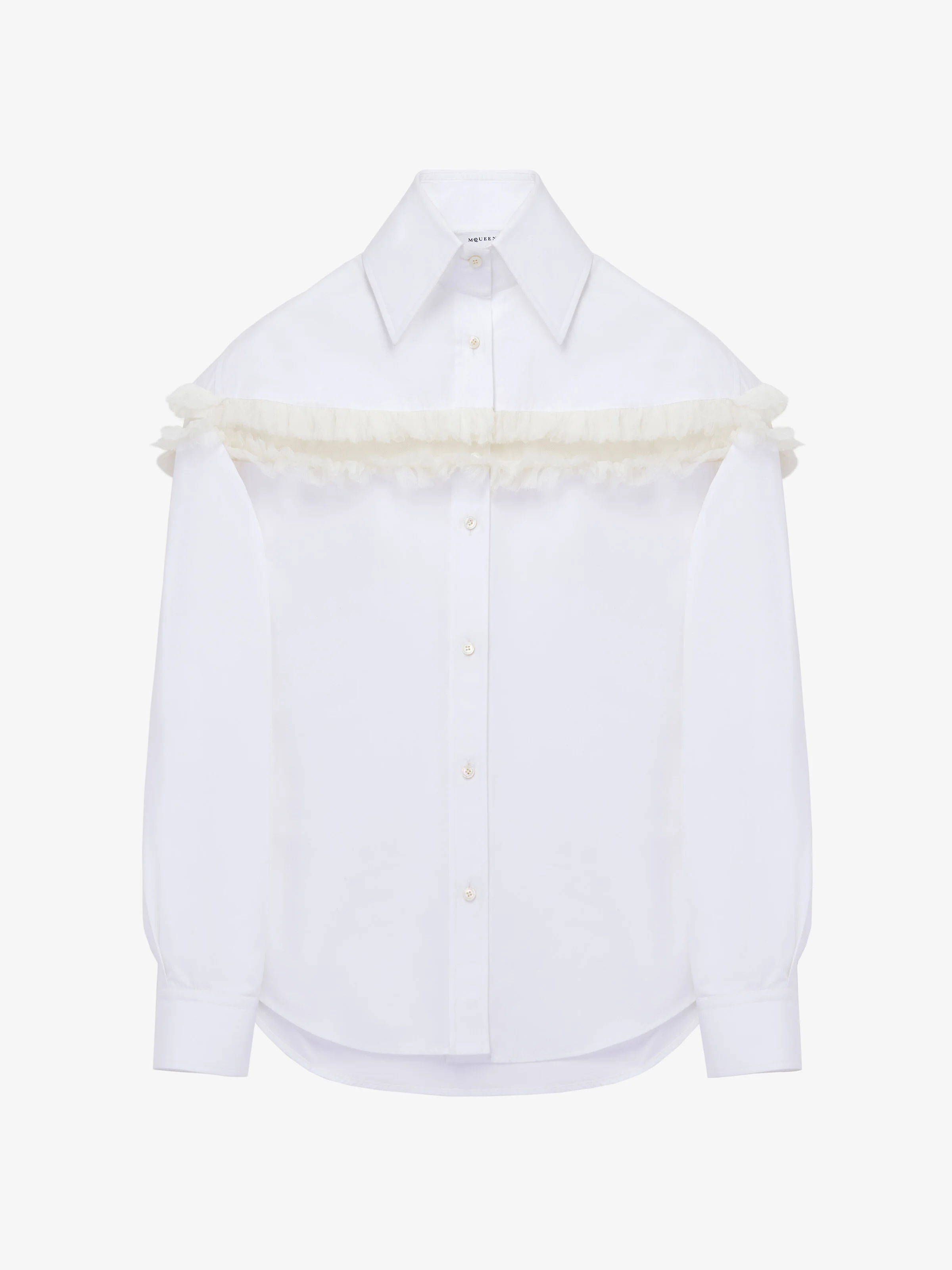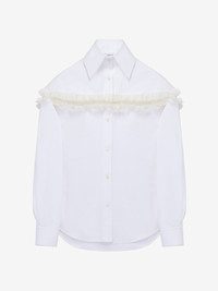Oversized point collar shirt in optical white compact cotton poplin. Gathered ivory chiffon and creponne detailing on a tonal tulle base. Finished with a front button fastening. Product details - Point collar - Front button fastening - Made with organic cotton yarn - Product code: 830386QAABC9000 - Made in Italy - Material: Cotton
