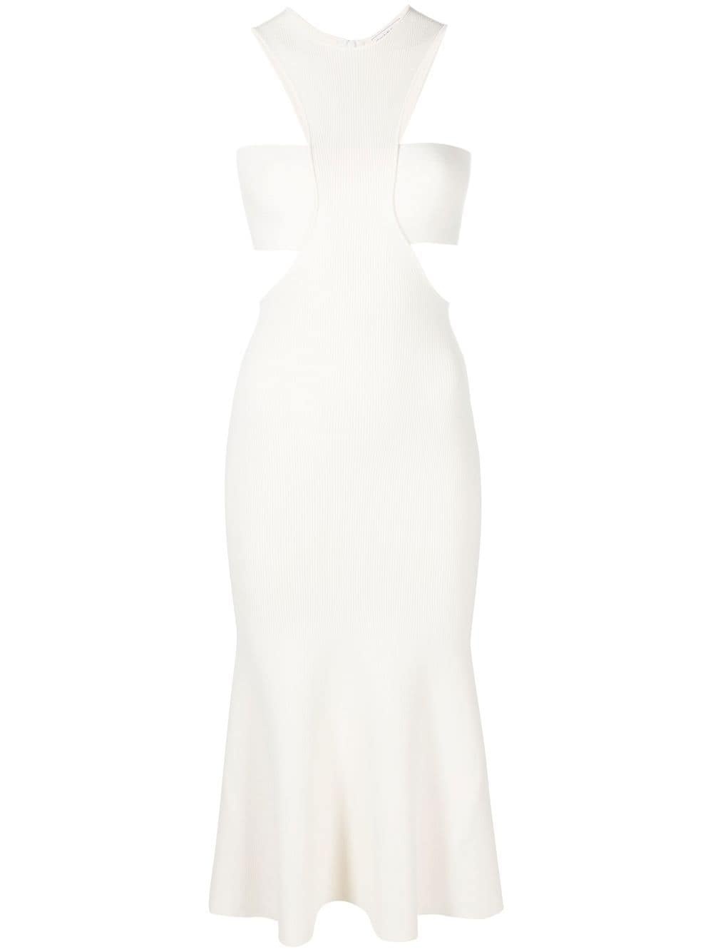 Slashed Harness rib-knit dress This Alexander McQueen dress pairs slashed details with a harness silhouette for a subversive look and feel. Styled with a slightly flared midi skirt, it presents a ribbed-knit finish in a pared-back ivory hue. Highlights - Ivory white - Ribbed knit - Cut-out detailing - Round neck - Sleeveless - Rear zip fastening - Flared - Mid-length Made in Italy Composition Viscose 85%, Polyester 15% SIZE & FIT Model measurements Height 5 ft 10 in(1.78 m) Bust/Chest 31.49 in(80 cm) Hips 35.03 in(89 cm) Waist 23.62 in(60 cm) FittingInformation This piece fits true to size. We recommend you get your regular size Designed for a close fit at the bust, waist and hips Made with a mid-weight fabric Measurement LENGTH 47.63 in(121 cm) WAIST 27.55 in(70 cm) HIPS 29.13 in(74 cm)