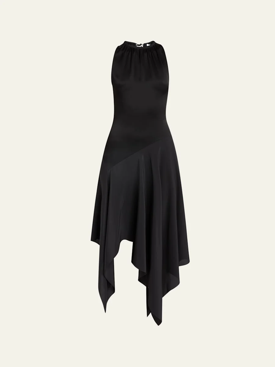 This McQueen midi dress is cut from fluid fabric, finished with a handkerchief hem that enhances the graceful movement Jewel neckline Sleeveless Highlow handkerchief hem Ankle length Aline silhouette Keyhole back selftie Viscose/acetate Dry clean Made in Italy