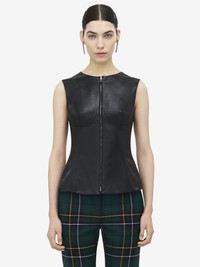 Sleeveless top in black grainy leather. Crew neck, seam detailing and front zip fastening. Product details - Crew neck - Front zip fastening - Product code: 838612Q5APU1000 - Made in Italy - Material: Lamb Leather