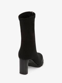 Black scuba stretch Slim Tread boot with a silver-finished zip, a tonal casual day rubber sole and a lacquered leather chunky heel. Boot silhouette with a round toe shape. Finished with an Alexander McQueen signature on the sole. Material: 100% Rubber
