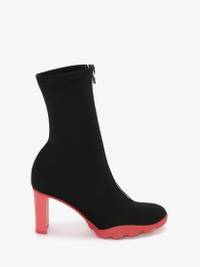 Black scuba stretch Slim Tread boot with a silver-finished zip, a coral casual day rubber sole and a lacquered leather chunky heel. Boot silhouette with a round toe shape. Finished with an Alexander McQueen signature on the sole. Material: 100% Rubber