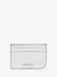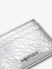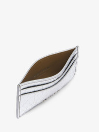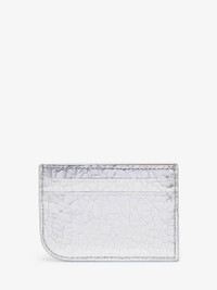 The McQueen Sling card holder – asymmetrical and crafted from beige suede calf leather covered with a metallic silver coating with a crackled effect. Features a central compartment and four card slots. Finished with a rounded right corner mirroring the McQueen T-Bar Sling bag. Product details - Dimensions: Length 10 x Height 7 x Depth 0.1 cm / 3.9 x 2.7 x 0.03 inches - One central compartment - Four card slots - McQueen metal lettering - Product code: 8135451VTAB1402 - Made in Italy - Material: Calf Leather