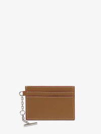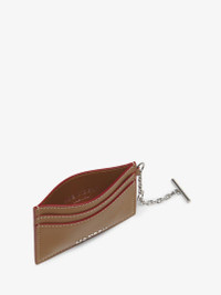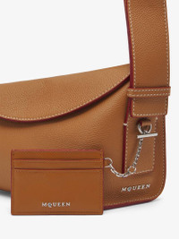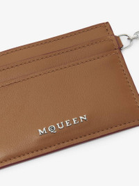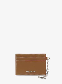 The McQueen T-Bar card holder – Handcrafted from tan smooth calf leather, with a central compartment and internal card slots. Finished with silver tone metal chain detail engraved with the McQueen logo. Can be attached to the Sling and T-Bar bags. Product details - Dimensions: Length 10 x Height 7 x Depth 0.1 cm / 3.9 x 2.7 x 0.03 inches - One central compartment - Four card slots - McQueen metal lettering - Shiny silver-finished chain with engraved metal T-Bar - Product code: 8044341T1AN2130 - Made in Italy - Material: Calf Leather
