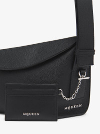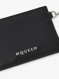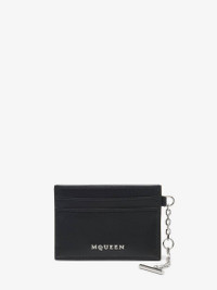The McQueen T-Bar card holder – Handcrafted from black smooth calf leather, with a central compartment and internal card slots. Finished with silver tone metal chain detail engraved with the McQueen logo. Can be attached to the Sling and T-Bar bags. Product details - Dimensions: Length 10 x Height 7 x Depth 0.1 cm / 3.9 x 2.7 x 0.03 inches - One central compartment - Four card slots - McQueen metal lettering - Shiny silver-finished chain with engraved metal T-Bar - Product code: 8044341T1AN1000 - Made in Italy - Material: Calf Leather