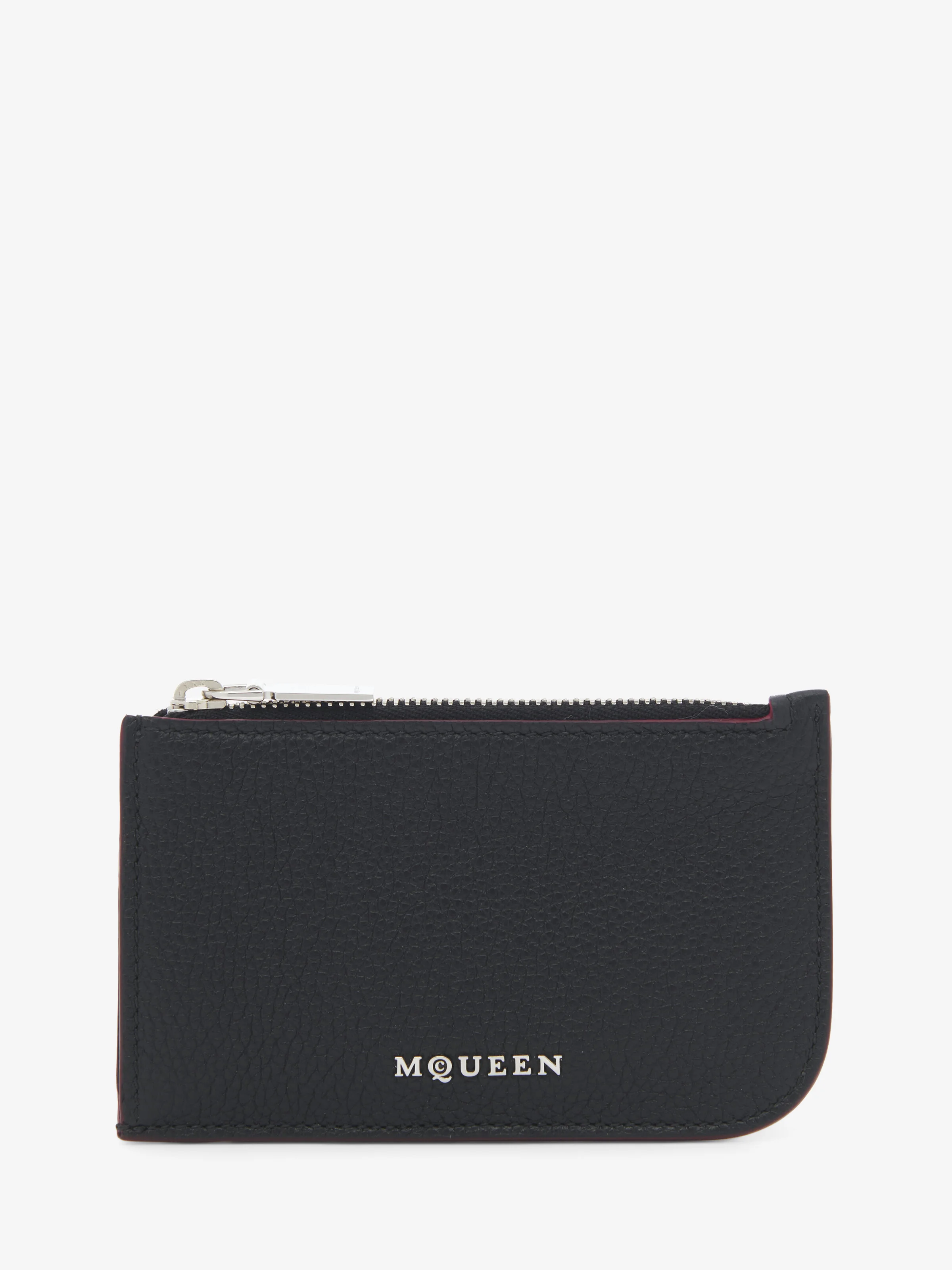 The McQueen Sling zip card holder – asymmetrical and crafted from black grainy calf leather with contrasting oxblood edge paint and featuring a central zip compartment and four card slots. Finished with a rounded right corner mirroring the McQueen T-Bar Sling bag. Product details - Dimensions: Length 12.5 x Height 7.5 x Depth 0.1 cm / 4.9 x 2.9 x 0.03 inches - One central zip compartment - Four card slots - McQueen metal lettering - Product code: 8135461VDCC1000 - Made in Italy - Material: Calf Leather