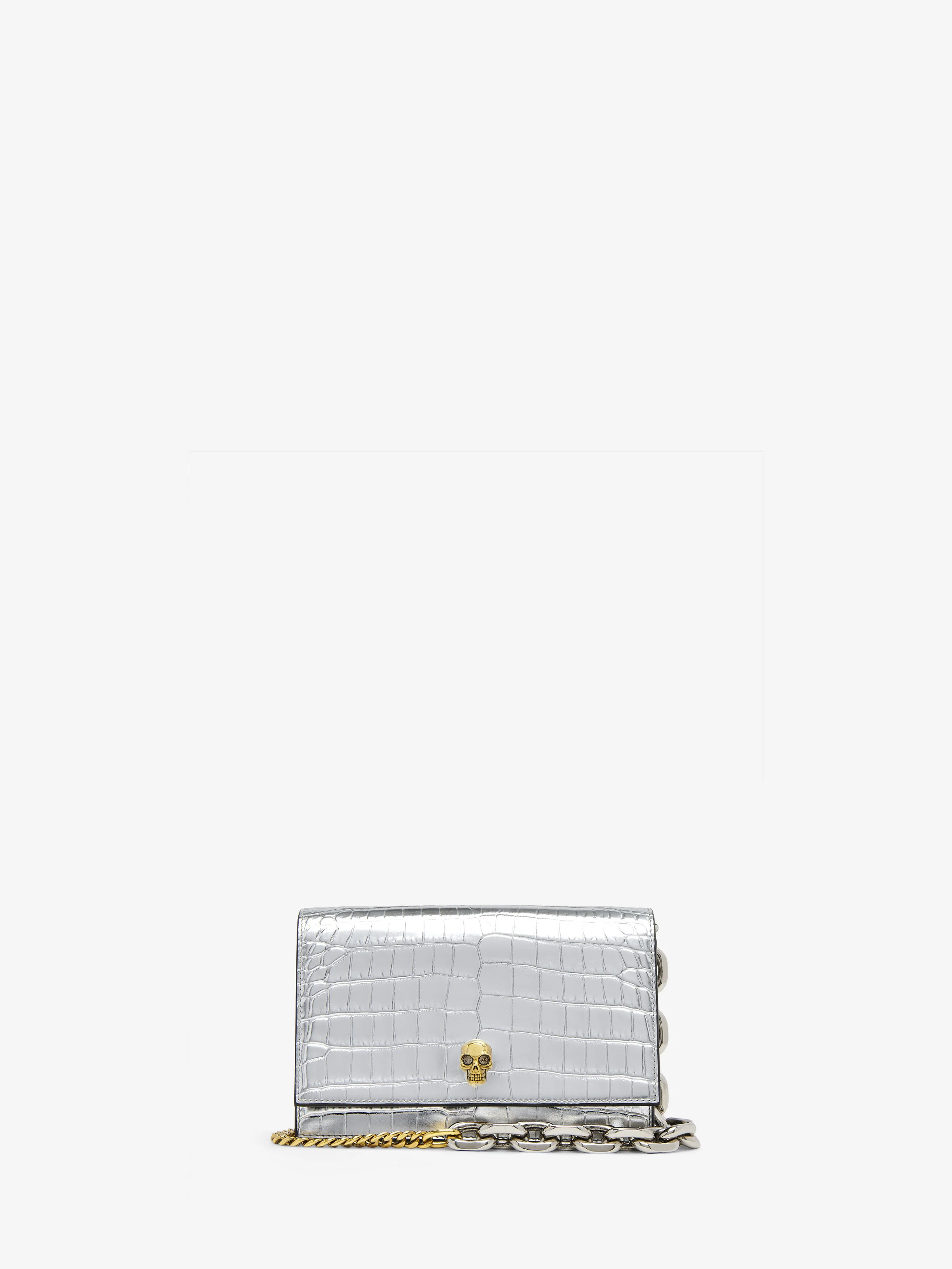 The Small Skull Bag – structured body in metallic silver calf leather with a shiny finishing, embossed with a crocodile-effect print with a skull-embellished flap. This bag can be worn cross-body with the two-tone chain strap. Product details - Dimensions: 19 x 13 x 5 cm / 7.4 x 5.1 x 1.9 inches - Magent fastening - One central compartment and one card pocket - Antique gold and antique silver-finished chain strap - Accommodates smartphones - Product code: 61308814C311402 - Made in Italy - Material: Calf Leather