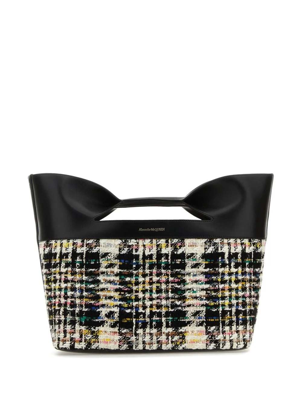 small The Bow tweed tote bag Reflective of Alexander McQueen's sculptural influences, this leather bag boasts a structured silhouette defined by the cut-out handle, shaped to resemble a bow. This small iteration is highlighted with a multicoloured tweed panel that contrasts with the black leather top. Highlights - Black/multicolour - Colour-block panelled design - Cotton tweed panelling - Leather panelling - Gold-tone logo lettering - Two rolled top handles - Adjustable detachable shoulder strap - Concealed magnetic fastening - Main compartment - Removable pouch with card slots Made in Italy Composition Outer: Leather 100%, Cotton 100% SIZE & FIT Measurement DEPTH 5.51 in(14 cm) HEIGHT 11.81 in(30 cm) STRAP 44.88 in(114 cm) WIDTH 12.2 in(31 cm)