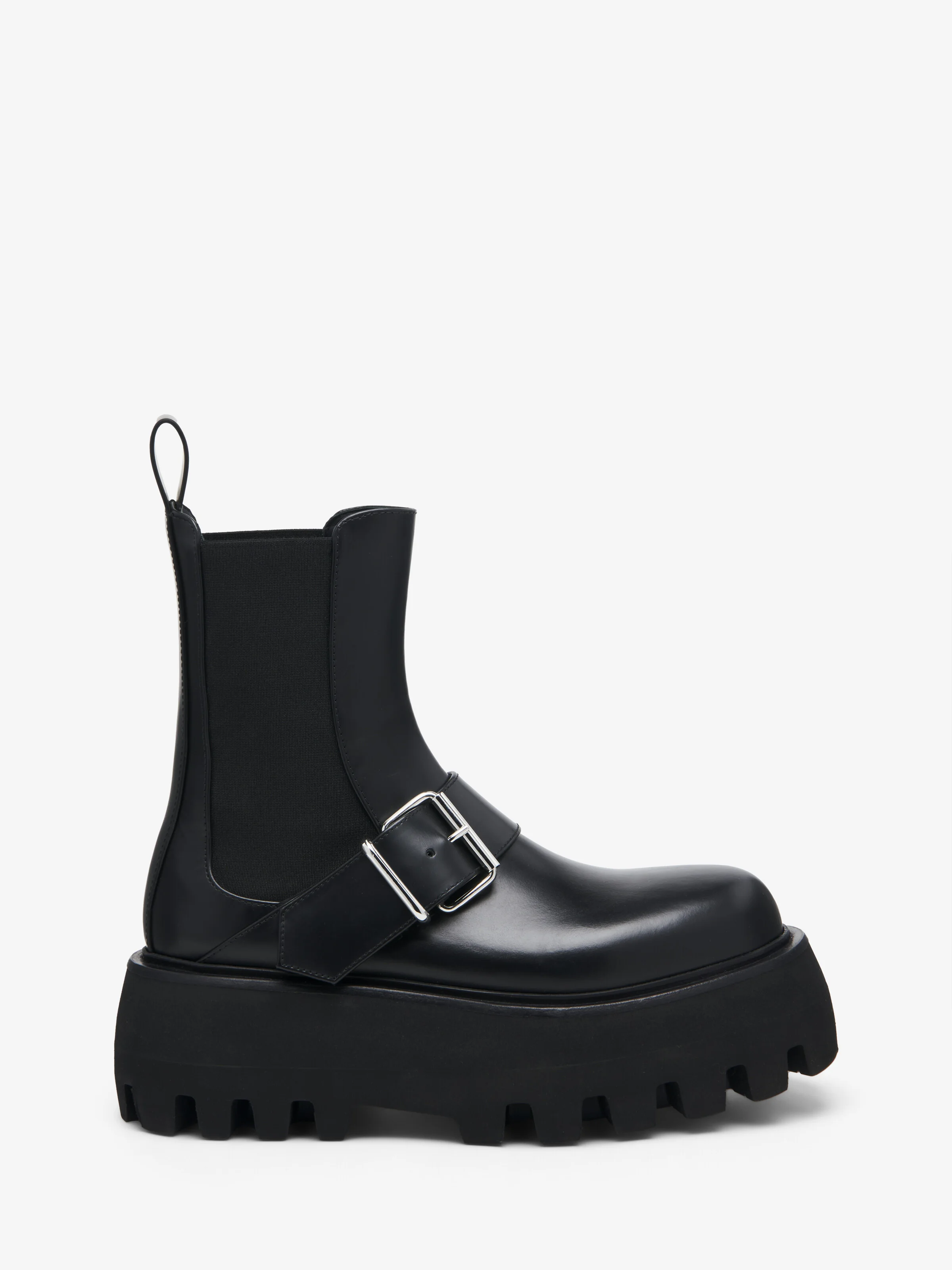 The Sofa Buckle Boot – black smooth calf leather with a sleek round toe silhouette. Tonal leather strap with silver metal buckle and lightweight chunky lug sole. Finished with elasticated side panels. Product details - Elasticated side panels - Round toe - Silver tone metal buckle - Chunky lug sole - Sole height: 65mm / 2.5 inches - Product code: 847956WHAEX1000 - Made in ITALY - Material: Calf Leather