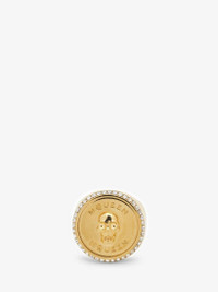 Gold-finished ring featuring a high-relief skull and engraved with a double McQueen logo. Finished with a clear crystal border. Eco-brass hardware. Product details - Dimensions: 2.1cm x 2.1cm / 0.8 x 0.8 inches - Eco brass hardware - Gold finish - Available in three sizes - Product code: 807027J160G4135 - Made in Italy - Material: Brass