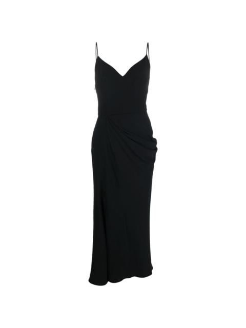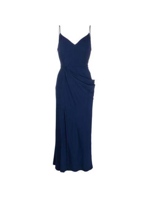 draped midi dress Highlights - Navy blue - Draped detailing - V-neck - Spaghetti straps - Concealed side zip fastening - Fitted waistline - Front slit - Mid-length - Straight hem Made in Italy Composition Viscose 52%, Acetate 48% SIZE & FIT Model measurements Height 5 ft 10 in(1.78 m) Bust/Chest 30.7 in(78 cm) Hips 34.64 in(88 cm) Waist 23.22 in(59 cm) FittingInformation Designed for a slim fit that sits just away from the body offering a close yet comfortable fit The dart stitching adds structure and a closer fit in the torso of this piece Made from a midweight non-stretch fabric This piece fits true to size – take your usual size Washing instructions Dry Clean Only