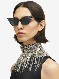 Crystal-embellished black acetate sunglasses fitted with solid smoke lenses. The sunglasses have a spiky cat-eye shape and are detailed with a lasered McQueen logo on the temples. All McQueen Eyewear is 100% certified UV protective (UVA and UVB rays). Product details - Product code: 856536J07631056 - Made in ITALY - Material: Plastic