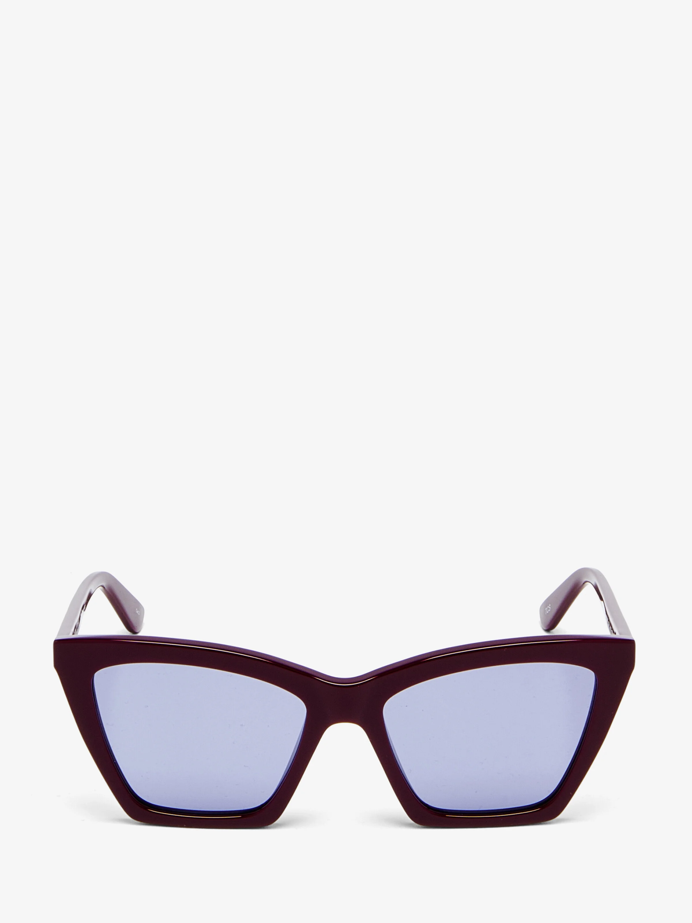 Burgundy acetate sunglasses fitted with solid blue lenses. The sunglasses have a geometric cat-eye shape and are detailed with a lasered McQueen logo on the temples. All McQueen eyewear is 100% certified UV protective (UVA and UVB rays). Product details - The Eastman Acetate Renew used in this style includes 27% recycled material achieved via mass balance approach. - Product code: 841637J07496344 - Made in ITALY - Material: Recycle Acetate & Bio Nylon Lens