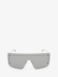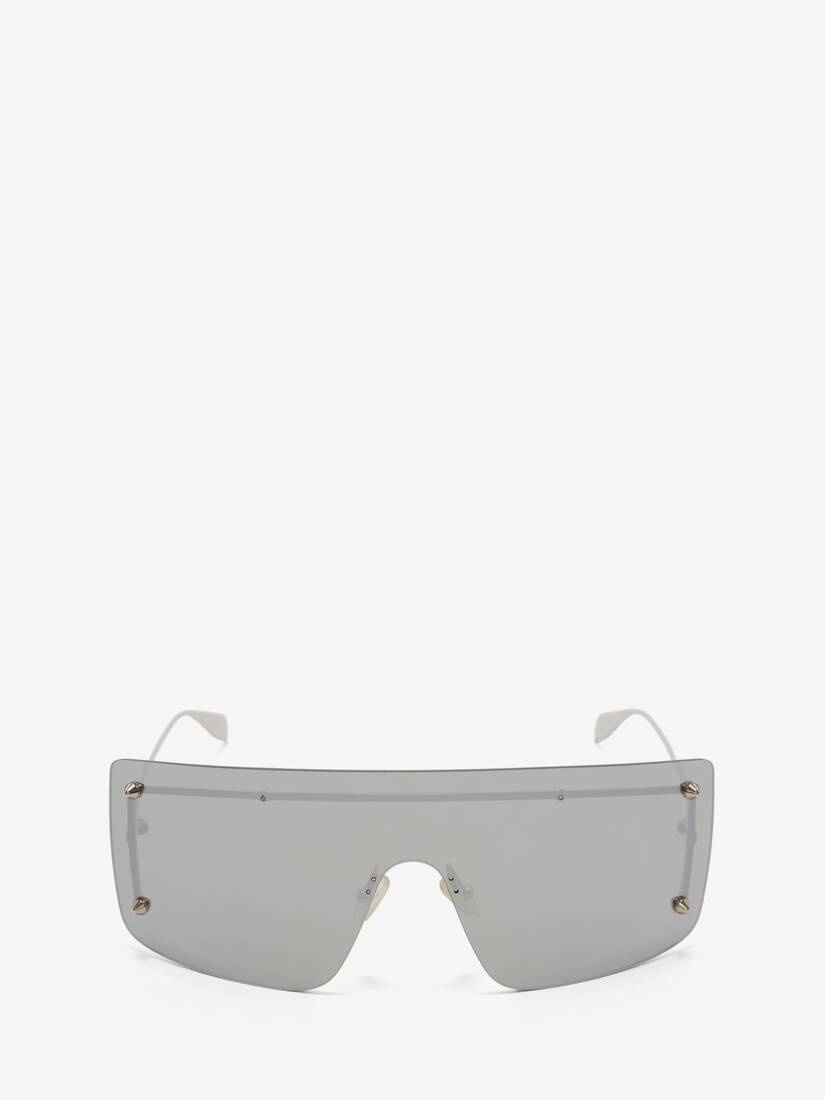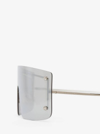 Unisex shiny silver oversized mask sunglasses fitted with a mirrored silver lens and detailed with silver spike studs on the front. The style is finished with adjustable nose pads and a lasered Alexander McQueen signature on the temples. All Alexander McQueen Eyewear is 100% certified UV protective (UVA and UVB rays). Material:100% Metal Product Code:744516I33101273
