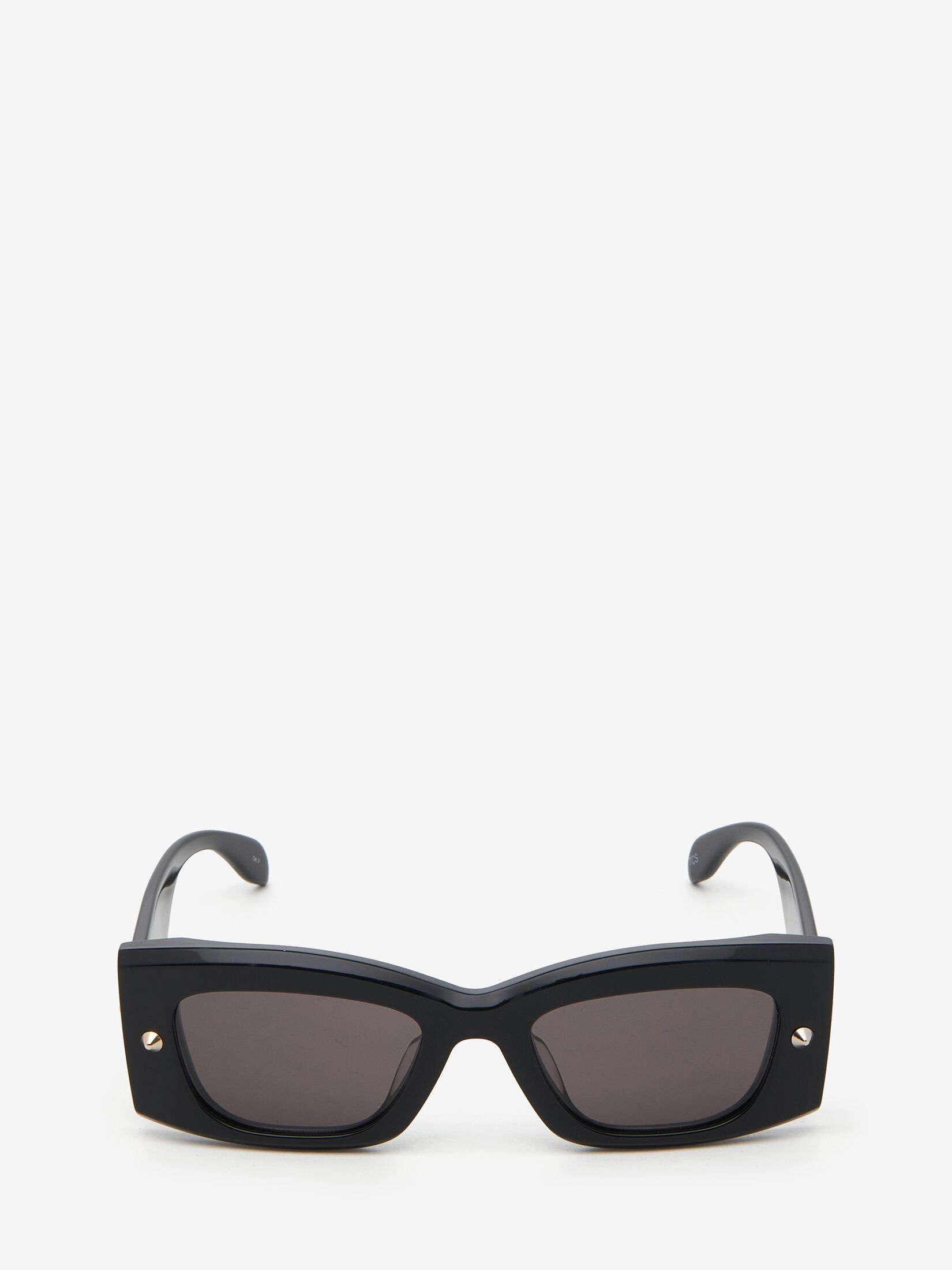 Black acetate sunglasses fitted with solid smoke lenses. The sunglasses have a rectangular shape and are detailed with two light gold metal spike studs on both the front and the temples. Finished with a tonal lasered Alexander McQueen signature.<br><br>All Alexander McQueen Eyewear is 100% certified UV protective (UVA and UVB rays). <br>This frame can be fitted with prescription lenses. Product details - Frame contains biobased (at least 35%) and recycled (27%) materials. Lenses contain 39% biobased material - Product code: 760621J07491056 - Made in Italy
