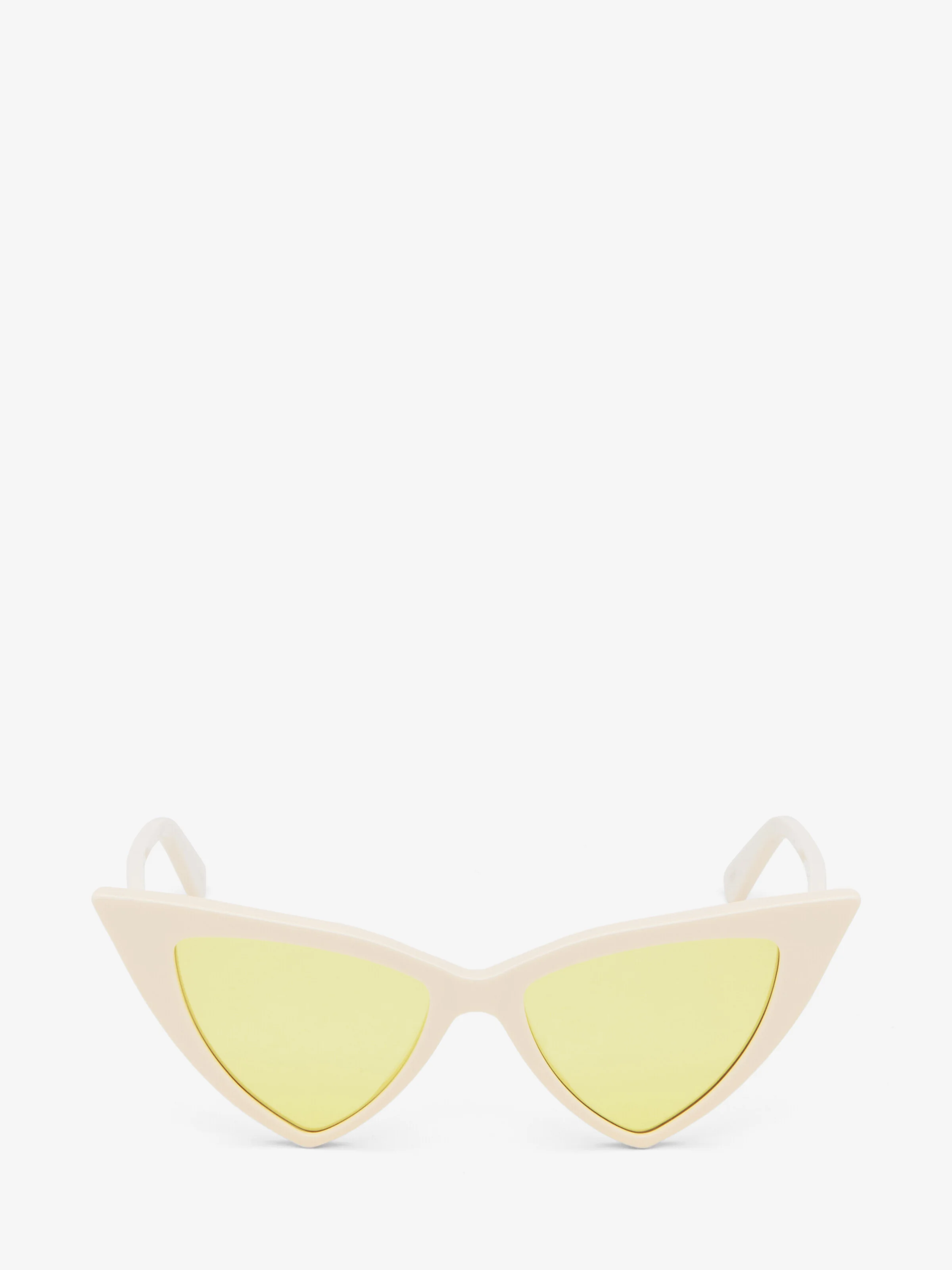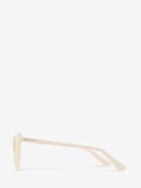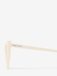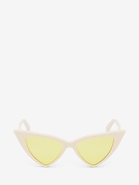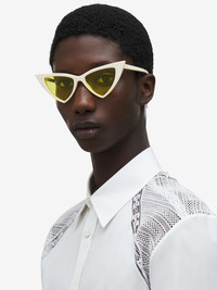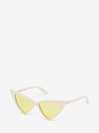 Ivory acetate sunglasses fitted with solid yellow lenses. The sunglasses have a sharp cat-eye shape and feature a lasered McQueen logo with silver enamel on the thin temples. All Alexander McQueen Eyewear is 100% certified UV protective (UVA and UVB rays). Product details - The Eastman Acetate Renew used in this style includes 27% recycled material achieved via mass balance approach. - Product code: 832519J07499133 - Made in Italy - Material: Recycle Acetate & Bio Nylon Lens