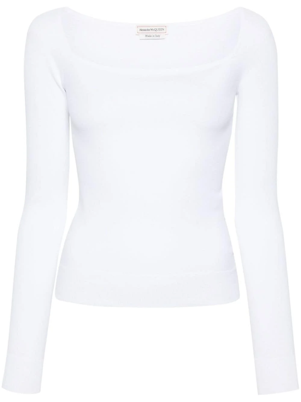 square-neck fine-knit top Highlights - White - Fine knit - Square neck - Long sleeves - Ribbed cuffs and hem - Straight hem Made in Italy Composition Viscose 83%, Polyester 17% SIZE & FIT Model measurements Height 5 ft 11 in(1.8 m) Bust/Chest 34.25 in(87 cm) Hips 35.82 in(91 cm) Waist 24.8 in(63 cm) Measurement LENGTH 20.86 in(53 cm) WAIST 28.34 in(72 cm) FittingInformation Designed for a close fit throughout Made with a midweight knit, this piece offers some stretch This piece fits true to size – take your usual size Washing instructions Dry Clean Only