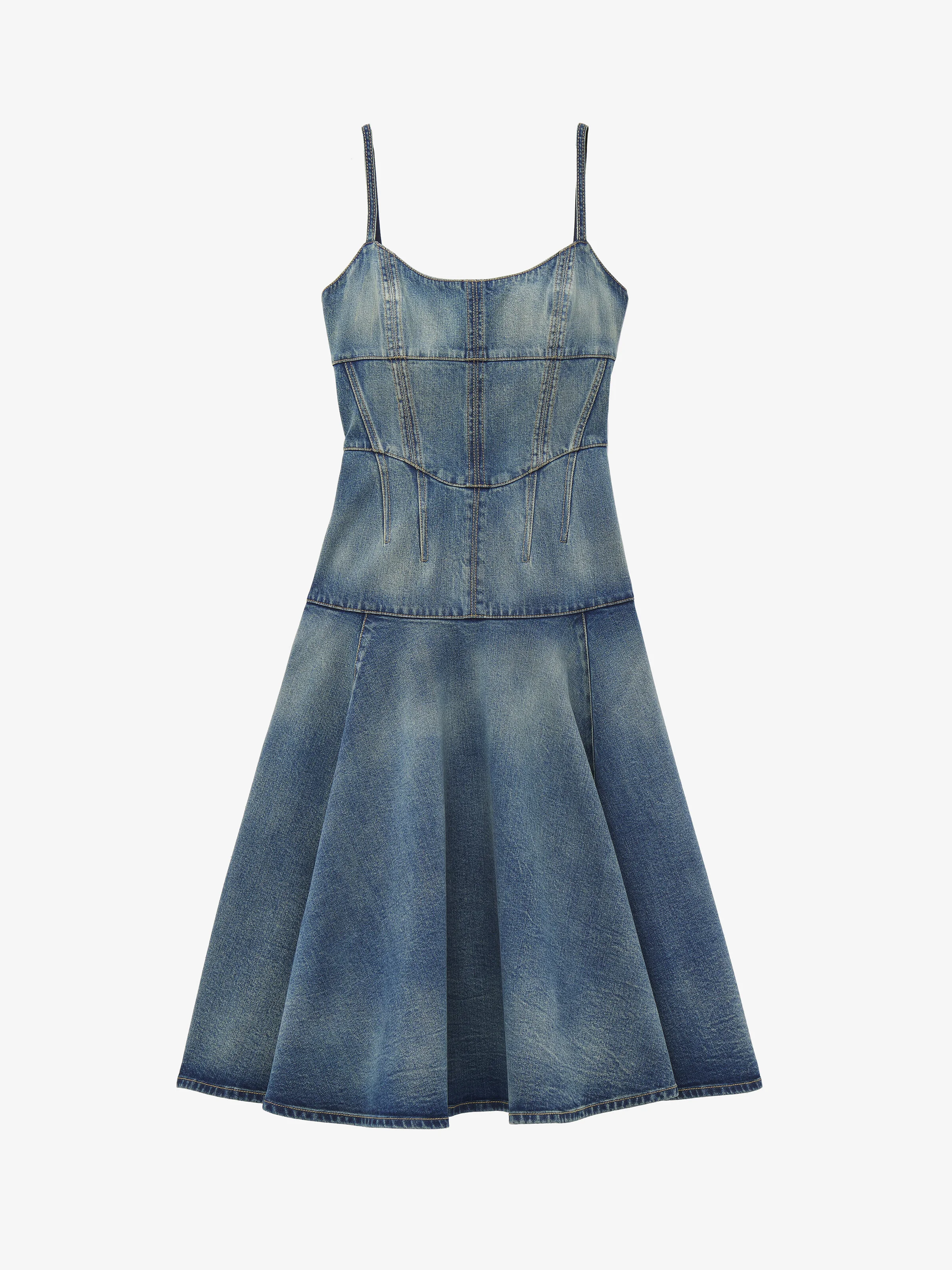 Sleeveless midi dress in indigo stonewashed stretch denim. Scoop neck, corset-inspired detailing and gathered skirt. Finished with a back zip fastening. Product details - Scoop neck - Sleeveless - Back zip fastening - Product code: 842157QMADG4315 - Made in Italy - Material: 98% Cotton, 2% Elastane