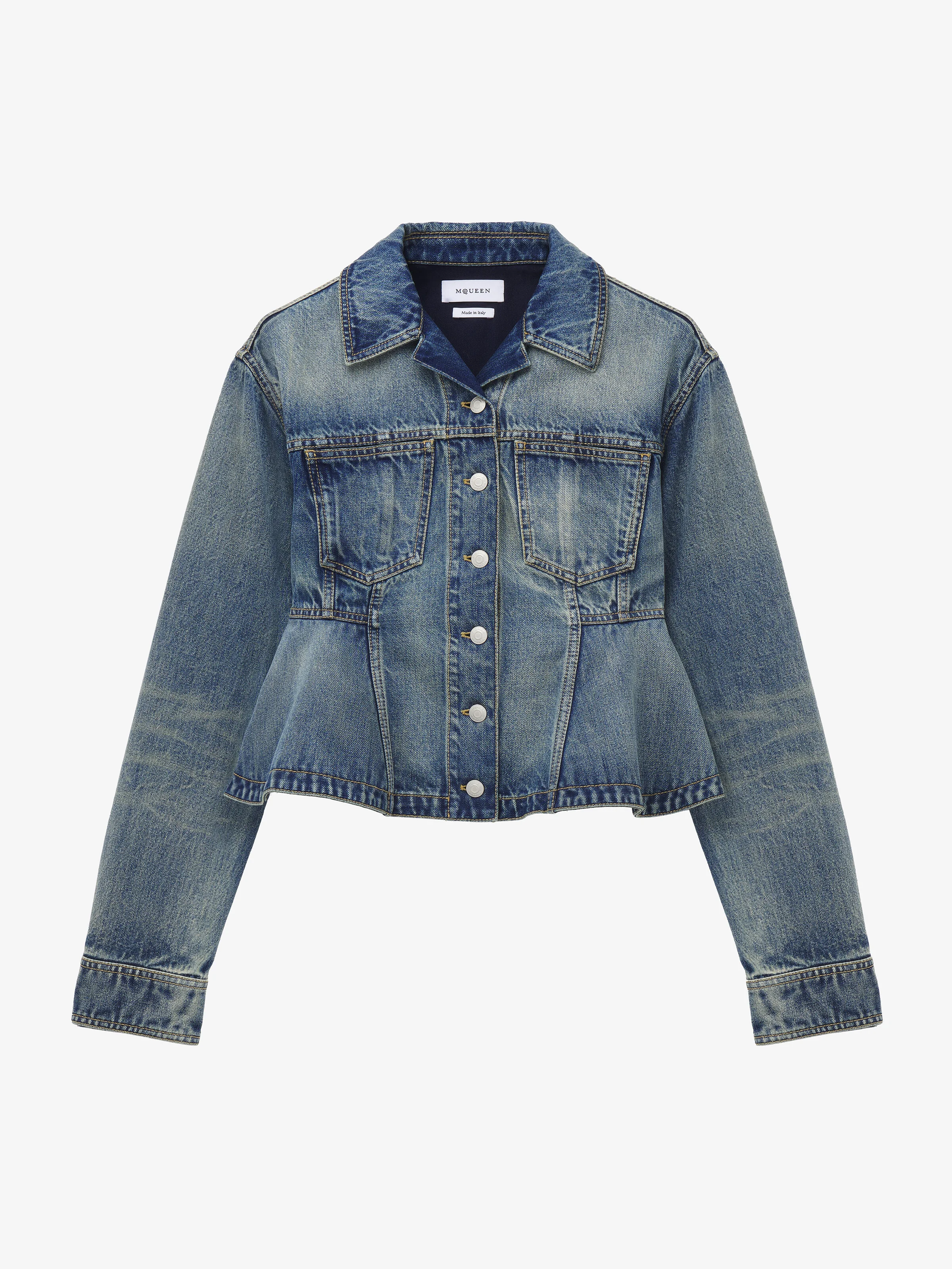 Peplum jacket in indigo stonewashed denim. Two patch pockets on the chest and seam detailing. Finished with a front button fastening. Product details - Collar - Side flap pockets - Made with organic cotton yarn - Front button fastening - Product code: 826755QMADF4315 - Made in Italy - Material: Cotton