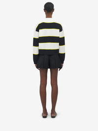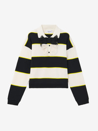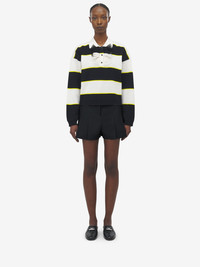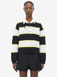 Striped polo jumper in black, ivory and citron cotton pique. Point collar with 3-button placket detailed with a silk ruffle. Product details - Point collar - Ruffle detailing - Long sleeves - Product code: 839848Q1BEQ1378 - Made in Italy - Material: 67% Viscose, 33% Cotton