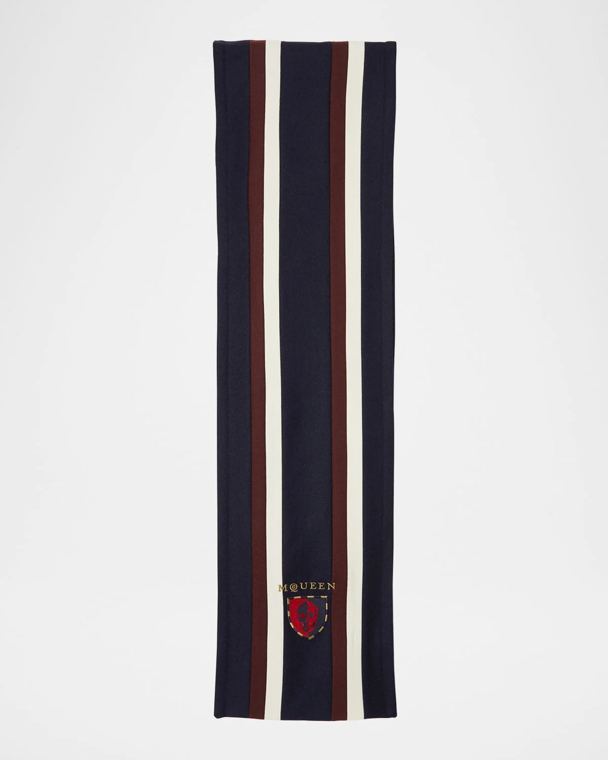 - McQueen striped scarf with collegiate crest motif - Can be styled multiple ways - Wool - Made in Italy