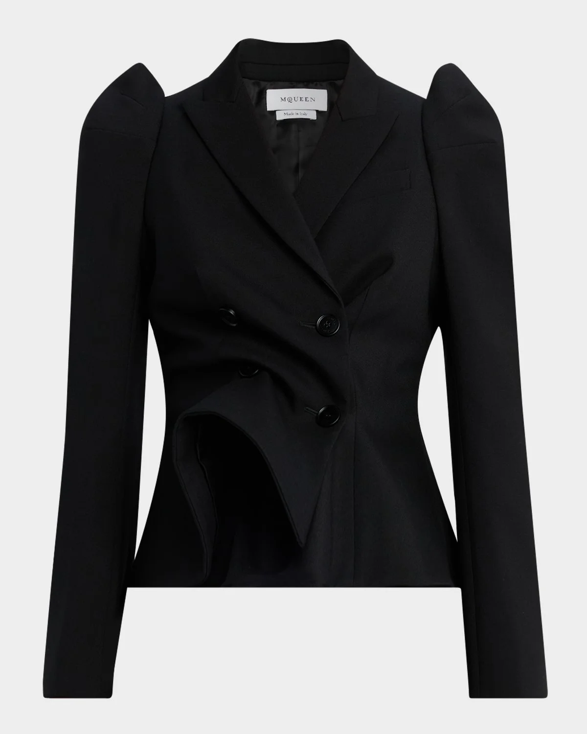 McQueen blazer jacket is sharply tailored in light stretch wool with structured shoulders and a draped button waist detail, elevating a timeless staple into a statement of modern elegance. Peak lapels; doublebreasted front Long sleeves; button cuffs Slim fit Hip length Button closure Wool/elastane/cupro Dry clean Made in Italy