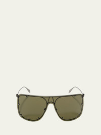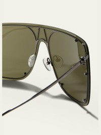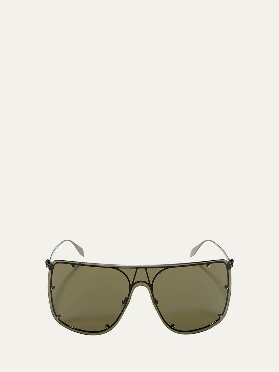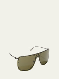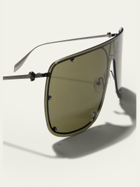 Alexander McQueen shield sunglasses in metal. Lens/bridge/temple (in mm): 99-10-135. Monochromatic lenses with studs. Straight brow line. Signature skull at temples. Adjustable nose pads. Thin, tapered arms. 100% UVA/UVB protection. Made in Italy. Proposition 65 warning for California residents Online Inquiries: BGS21_D3WUU| Store Inquiries: #4025998