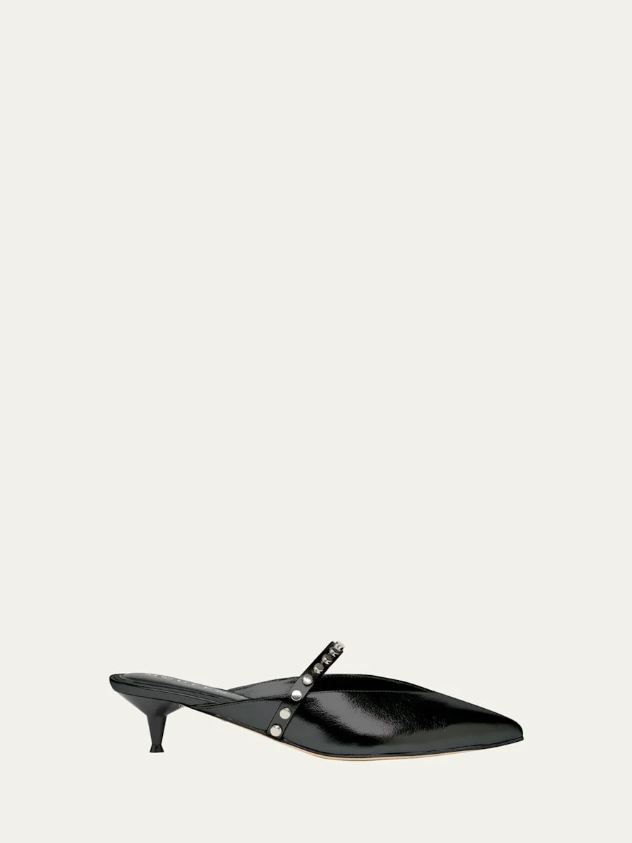 McQueen mules in shiny faux leather (polyurethane) with a studded thin vamp strap detail 2.00 in / 50 mm kitten heel Pointed toe Easy slide style Leather outsole Lining: Unlined Made in Italy Online Inquiries: BGS21_X6XQM| Store Inquiries: #5041920