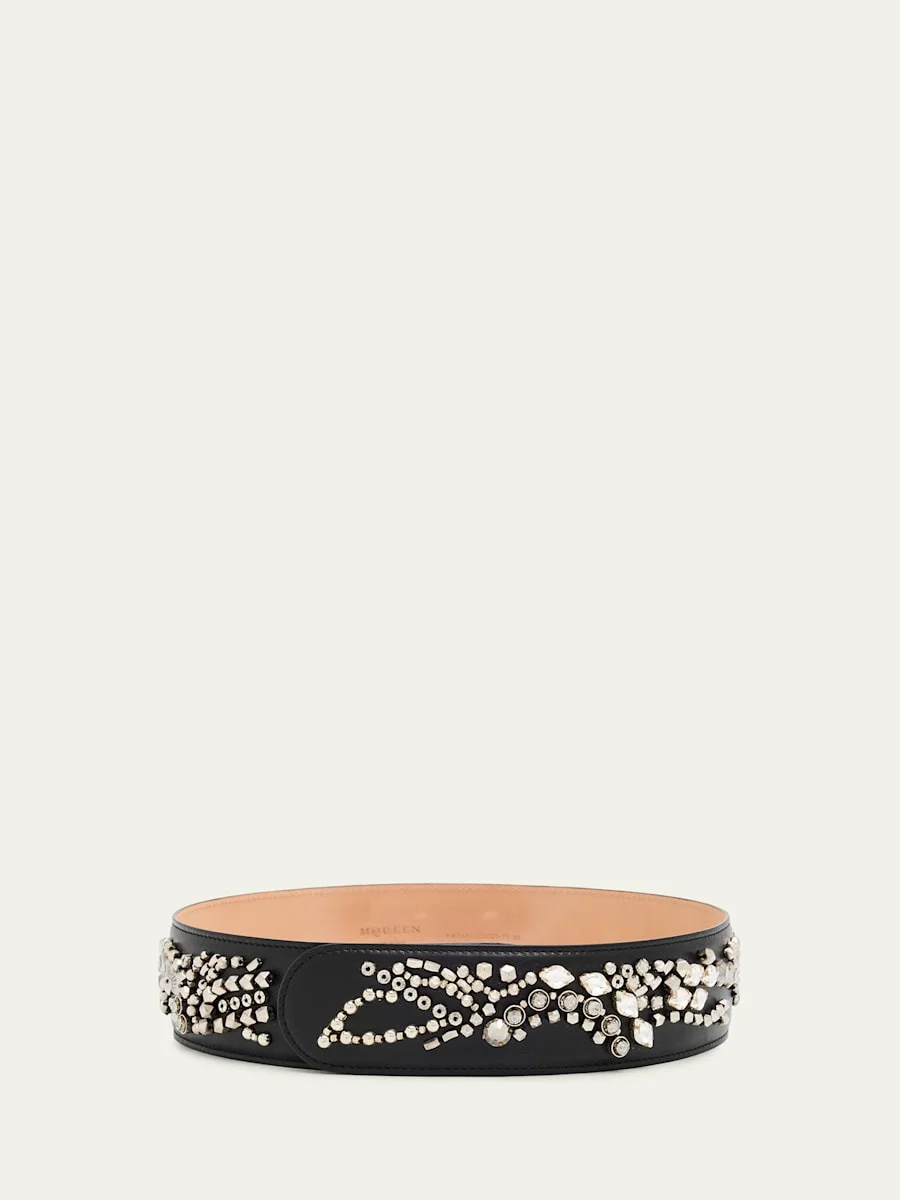 Crafted of leather, McQueen's sunflower crystal embroidery embellished belt adds a touch of sparkle to a classic accessory. Tbar closure Adjustable fit Leather Made in Italy