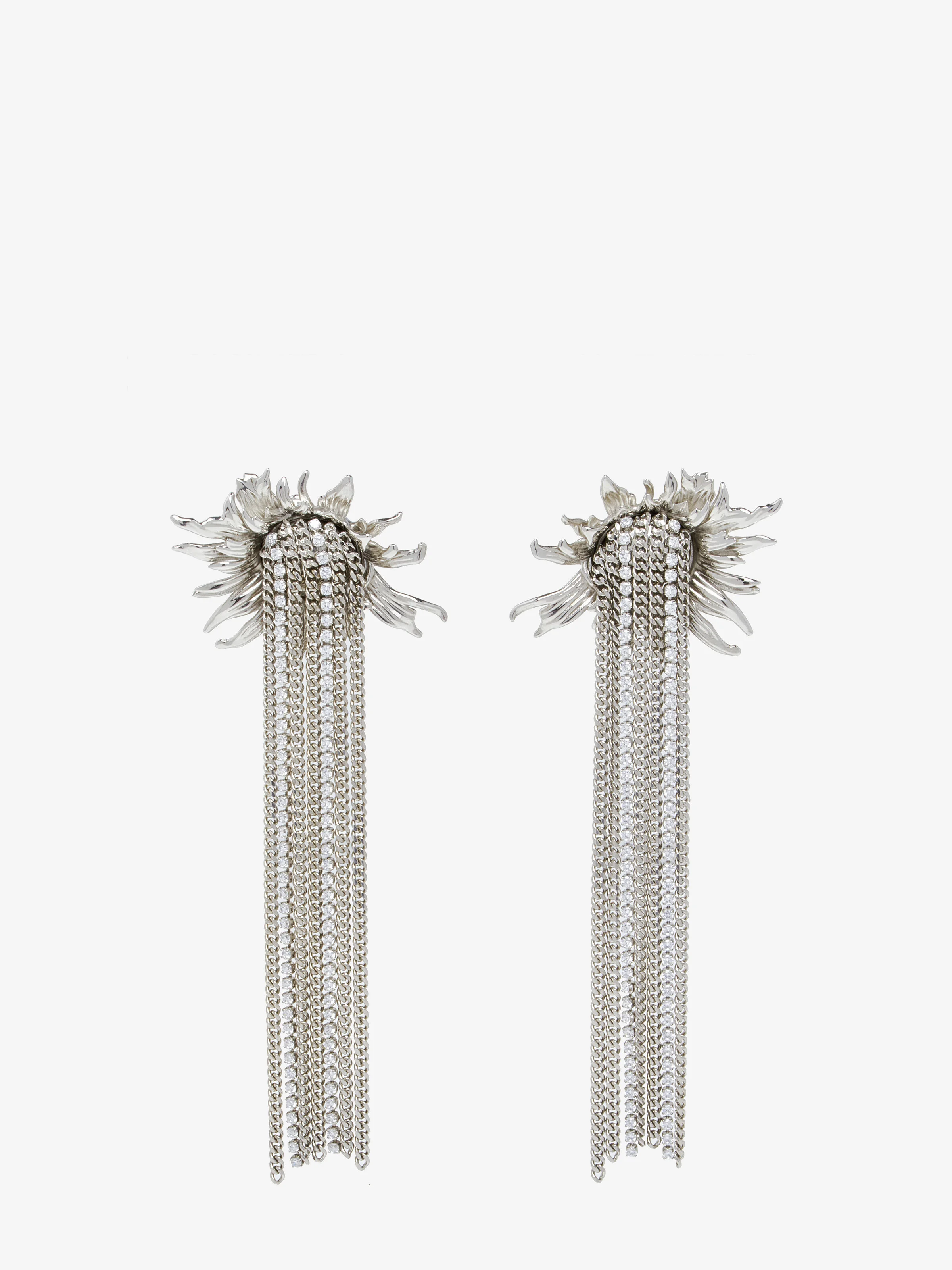 Palladium-finished pendant earrings featuring a sunflower with cascading crystal-embellished chains. Brass hardware with McQueen logo engraving on the back. Suitable for pierced ears. Product details - Height: 12cm / 4.7 inches - Brass hardware - Palladium finish - Suitable for pierced ears - Push-back closure - For hygiene reasons, we do not accept returns or exchanges on all pierced earrings. - Product code: 847464J161B1021 - Made in ITALY - Material: Brass