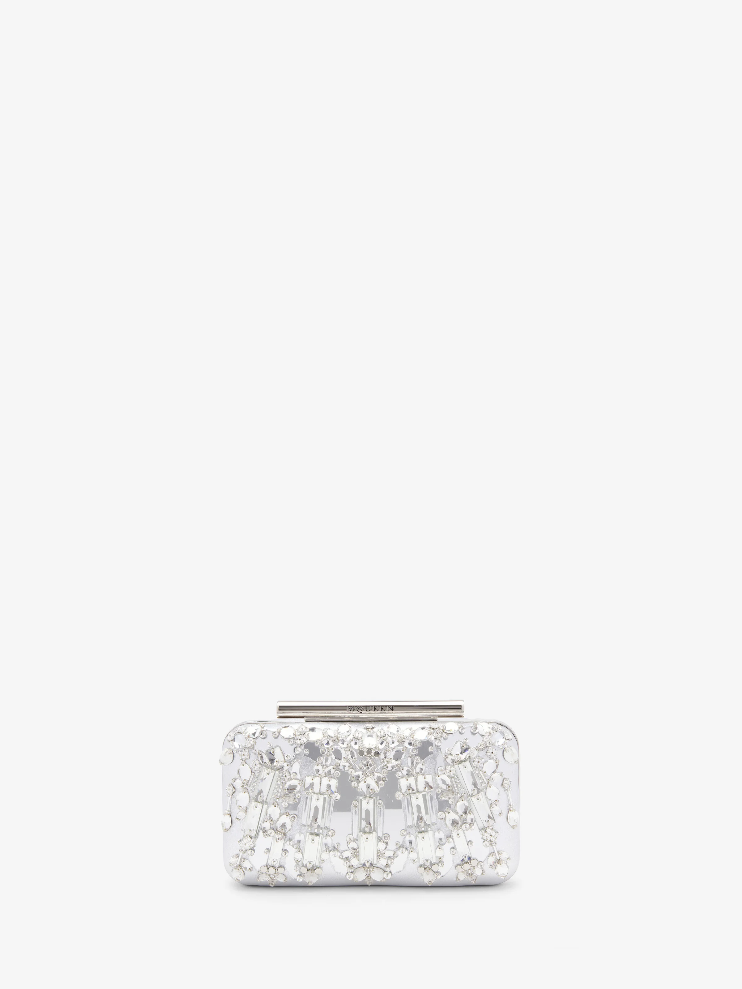 The T-Bar box clutch – metallic silver leather embellished with handcrafted crystal mirror embroidery. Shiny silver tone T-Bar clasp closure engraved with the McQueen logo. Can be worn handheld or on the shoulder with the removable chain strap. Product details - Dimensions: Length 19 x Height 10 x Depth 4.5cm / 7.4 x 3.9 x 1.7 inches - Strap drop: 53cm / 20.8 inches - T-Bar clasp closure with McQueen logo - One main compartment - Extractable metal hooks for detachable chain strap - Brass hardware with silver tone - Light pink suede lining - Product code: 8137151HBC18490 - Made in ITALY - Material: Lamb Leather
