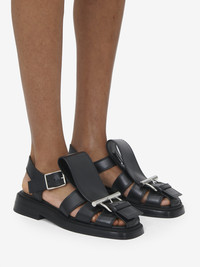 The T-Bar caged sandal - Smooth black calf leather with a square toe silhouette. Detailed with an exaggerated strap with a silver tone metal T-Bar buckle engraved with the McQueen logo. Product details - Square toe - Leather sole - Heel height: 25mm - Product code: 814293WHACC1064 - Made in Italy - Material: Calf Leather